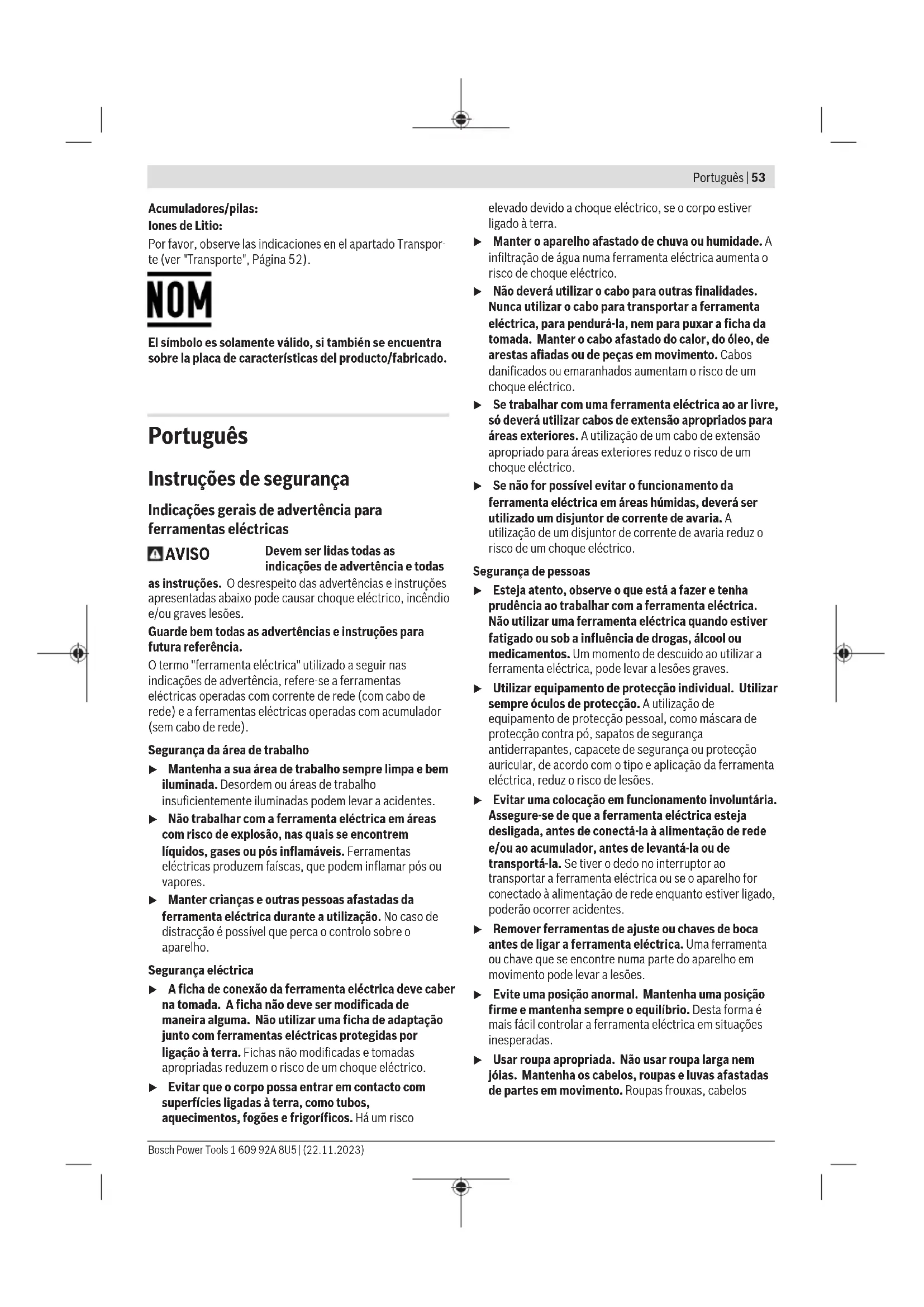 1,5 1,5 1,5 O nível de vibrações indicado nestas instruções e o valor de emissões sonoras foram medidos de acordo com um processo de medição normalizado e podem ser utilizados para a comparação de ferramentas elétricas. Também são adequados para uma avaliação provisória das emissões sonoras e de vibrações. O nível de vibrações indicado e o valor de emissões sonoras representam as aplicações principais da ferramenta elétrica. Se a ferramenta elétrica for utilizada para outras aplicações, com outras ferramentas de trabalho ou com manutenção insuficiente, é possível que o nível de vibrações e de emissões sonoras seja diferente. Isto pode aumentar sensivelmente a emissão sonora e de vibrações para o período completo de trabalho. Para uma estimação exata da emissão sonora e de vibrações, também deveriam ser considerados os períodos nos quais o aparelho está desligado ou funciona, mas não está sendo utilizado. Isto pode reduzir a emissão sonora e de vibrações durante o completo período de trabalho. Além disso também deverão ser estipuladas medidas de segurança para proteger o operador contra o efeito de vibrações, como por exemplo: manutenção de ferramentas elétricas e acessórios, manter as mãos quentes e organização dos processos de trabalho. Bateria u A bateria deverá ser retirada antes de todos os trabalhos na ferramenta elétrica (p. ex. manutenção, troca de ferramenta etc.) e antes de transportar ou de armazenar a mesma. Há perigo de ferimentos se o interruptor de ligar/desligar for acionado involuntariamente. Bosch vende ferramentas elétricas sem fio também sem bateria. Pode consultar na embalagem se está incluída uma bateria no volume de fornecimento da sua ferramenta elétrica. Carregar a bateria u Utilize apenas os carregadores listados nos dados técnicos. Só estes carregadores são apropriados para os baterias de lítio utilizadas para a sua ferramenta elétrica. Nota: devido a normas de transporte internacionais, as baterias de lítio são fornecidas parcialmente carregadas. Para assegurar a completa potência da bateria, a bateria deverá ser carregada completamente antes da primeira utilização. Colocar a bateria Insira a bateria carregada no respetivo encaixe, até que esta esteja engatada. Retirar a bateria Para retirar a bateria, pressione a respetiva tecla de desbloqueio e puxe a bateria para fora. Não empregue força. A bateriapossui 2 níveis de travamento, que devem evitar, que a bateria caia, caso a tecla de desbloqueio da bateriaseja premida por acaso. Enquanto a bateria estiver dentro da ferramenta elétrica, ela é mantida em posição por uma mola. Indicador do nível de carga da bateria Nota: Nem todos os tipos de bateria dispõem de um indicador do nível de carga de bateria. Os LEDs verdes do indicador do nível de carga da bateria indicam o nível de carga da bateria. Por motivos de segurança, a consulta do nível de carga só é possível com a ferramenta elétrica parada. Prima a tecla para o indicador do nível de carga da bateria ou para visualizar o nível de carga. Isto também é possível com a bateria removida. Se, depois de premir a tecla para o indicador do nível de carga da bateria, não se acender qualquer LED, a bateria tem defeito e tem de ser substituída. O nível de carga da bateria também é indicado na interface do utilizador (ver "Indicadores de estado", Página59). Tipo de bateria GBA 18V... LED Capacidade Luz permanente 3× verde 60–100% Bosch Power Tools 1 609 92A 8U5 | (22.11.2023)58 | Português LED Capacidade Luz permanente 2× verde 30–60% Luz permanente 1× verde 5–30% Luz intermitente 1× verde 0–5% Tipo de bateria ProCORE18V... LED Capacidade Luz permanente 5× verde 80–100% Luz permanente 4× verde 60–80% Luz permanente 3× verde 40–60% Luz permanente 2× verde 20–40% Luz permanente 1× verde 5–20% Luz intermitente 1× verde 0–5% Indicações sobre o manuseio ideal da bateria Proteger a bateria contra humidade e água. Armazene a bateria apenas na faixa de temperatura de −20°C a 50°C. Por exemplo, não deixe a bateria dentro do automóvel no verão. Limpar de vez em quando as aberturas de ventilação da bateria com um pincel macio, limpo e seco. Um tempo de funcionamento reduzido após o carregamento indica que a bateria está gasta e que deve ser substituída. Observe as indicações sobre a eliminação de forma ecológica. Montagem u A bateria deverá ser retirada antes de todos os trabalhos na ferramenta elétrica (p. ex. manutenção, troca de ferramenta etc.) e antes de transportar ou de armazenar a mesma. Há perigo de ferimentos se o interruptor de ligar/desligar for acionado involuntariamente. Carregar o carregador (ver figuras A1−A4) u Remova a bateria antes de executar ajustes na ferramenta, de substituir acessórios ou de guardar a ferramenta elétrica. Esta medida preventiva evita um arranque inadvertido da ferramenta elétrica. Utilize apenas acessórios originais Bosch. As peças de precisão da ferramenta elétrica como o carregador, o bocal e o canal de disparo estão adaptadas aos agrafos, pregos e pinos da Bosch. Outros fabricantes utilizam outras qualidades de aço e dimensões. Nota: utilize apenas elementos fixadores especificados na tabela «Dados Técnicos». A utilização de elementos fixadores não permitidos pode danificar a ferramenta elétrica e causar ferimentos. Durante o carregamento da ferramenta elétrica, segure o carregador de forma a que o bocal (18) não aponte para o seu corpo nem para o corpo de outra pessoa. – Se necessário, limpe o cursor do carregador (15) e certifique-se de que o carregador (14) não está sujo. – Insira uma tira de pregos (20) adequada na ranhura em T no final do carregador (14). – Empurre a tira de pregos no carregador para a frente até que o último prego fique à frente da mola do carregador (21). Nota: uma monitorização eletrónica deteta de existem 
