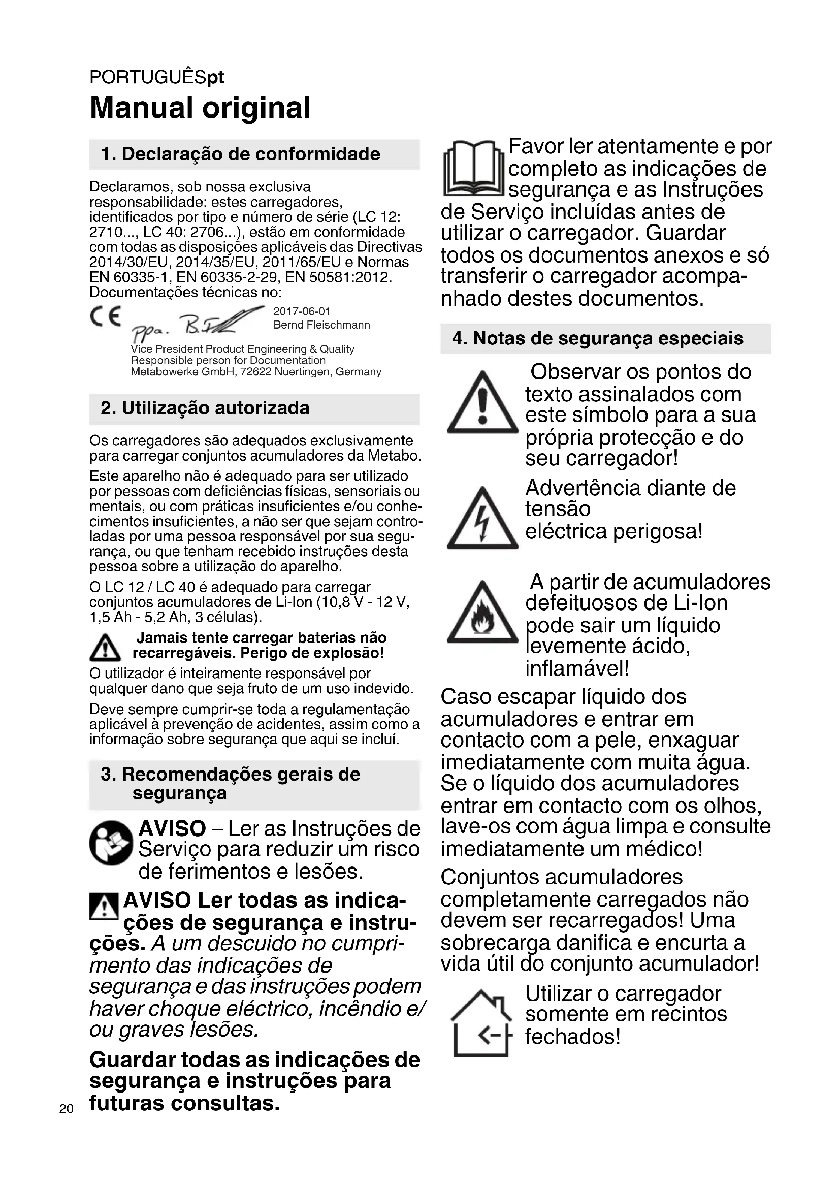 Baixe as instruções para o seu Carregador de pilhas em formato PDF gratuitamente! Encontre o seu manual LC 12 - METABO e retome o controlo do seu dispositivo eletrónico. Nesta página estão publicados todos os documentos necessários para a utilização do seu dispositivo. LC 12 da marca METABO.