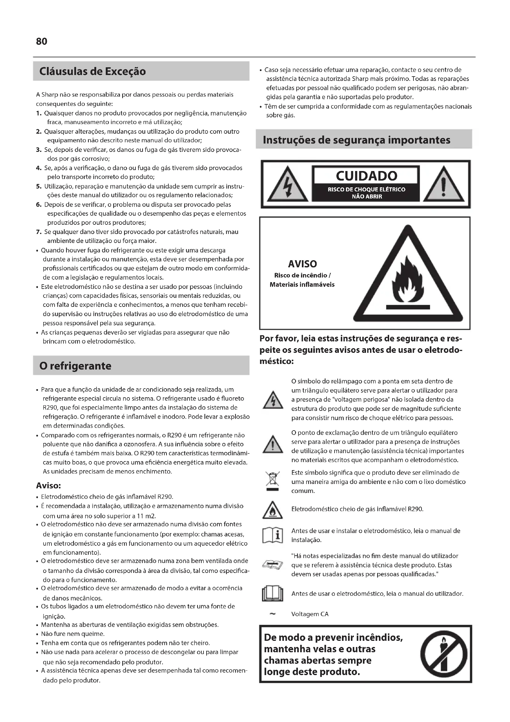 - Eletrodoméstico cheio de gás inamável R290.• É recomendada a instalação, utilização e armazenamento numa divisão com uma área no solo superior a 11 m2.• O eletrodoméstico não deve ser armazenado numa divisão com fontes de ignição em constante funcionamento (por exemplo: chamas acesas, um eletrodoméstico agás em funcionamento ou um aquecedor elétrico em funcionamento).• O eletrodoméstico deve ser armazenado numa zona bem ventilada onde otamanho da divisão corresponda à área da divisão, tal como especica-do para o funcionamento.• O eletrodoméstico deve ser armazenado de modo a evitar a ocorrência de danos mecânicos.• Os tubos ligados a um eletrodoméstico não devem ter uma fonte de ignição.• Mantenha as aberturas de ventilação exigidas sem obstruções.• Não fure nem queime.• Tenha em conta que os refrigerantes podem não ter cheiro.• Não use nada para acelerar o processo de descongelar ou para limpar que não seja recomendado pelo produtor.• A assistência técnica apenas deve ser desempenhada tal como recomen-dado pelo produtor.• Caso seja necessário efetuar uma reparação, contacte o seu centro de assistência técnica autorizada Sharp mais próximo. Todas as reparações efetuadas por pessoal não qualicado podem ser perigosas, não abran-gidas pela garantia e não suportadas pelo produtor.• Têm de ser cumprida a conformidade com as regulamentações nacionais sobre gás. Instruções de segurança importantes CUIDADO RISCO DE CHOQUE ELÉTRICONÃO ABRIR AVISO Risco de incêndio / Materiais inamáveis Por favor, leia estas instruções de segurança e res- peite os seguintes avisos antes de usar o eletrodo- méstico: O símbolo do relâmpago com a ponta em seta dentro de um triângulo equilátero serve para alertar o utilizador para a presença de "voltagem perigosa" não isolada dentro da estrutura do produto que pode ser de magnitude suciente para consistir num risco de choque elétrico para pessoas.O ponto de exclamação dentro de um triângulo equilátero serve para alertar o utilizador para a presença de instruções de utilização e manutenção (assistência técnica) importantes no materiais escritos que acompanham o eletrodoméstico.Este símbolo signica que o produto deve ser eliminado de uma maneira amiga do ambiente e não com o lixo doméstico comum.Eletrodoméstico cheio de gás inamável R290.Antes de usar e instalar o eletrodoméstico, leia o manual de instalação."Há notas especializadas no m deste manual do utilizador que se referem à assistência técnica deste produto. Estas devem ser usadas apenas por pessoas qualicadas."Antes de usar o eletrodoméstico, leia o manual do utilizador.Voltagem CA De modo a prevenir incêndios, mantenha velas e outras chamas abertas sempre longe deste produto. CAUTION