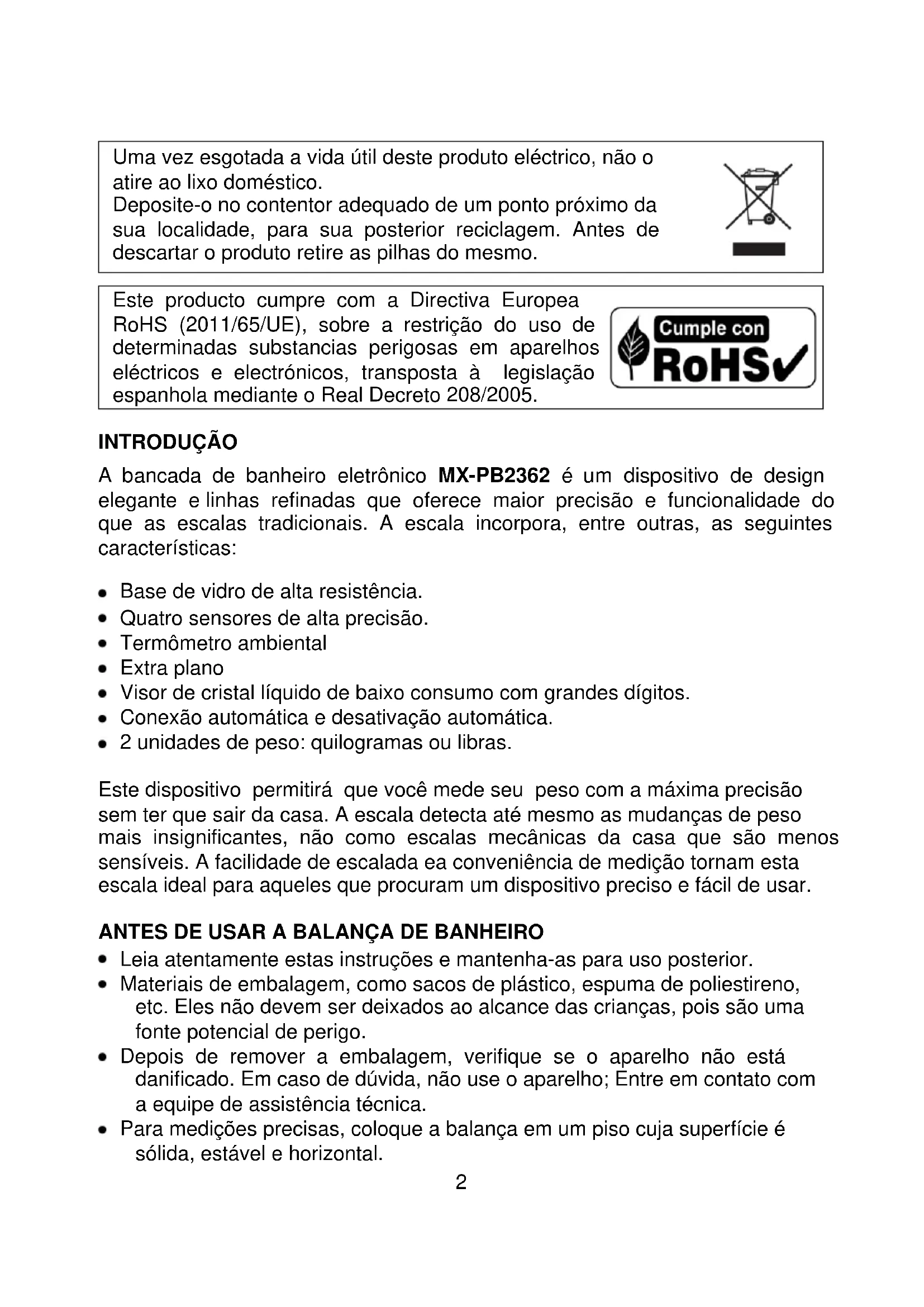 A bancada de banheiro eletrônico MX-PB2362 é um dispositivo de design elegante e linhas refinadas que oferece maior precisão e funcionalidade do que as escalas tradicionais. A escala incorpora, entre outras, as seguintes características: Base de vidro de alta resistência. Quatro sensores de alta precisão. Termômetro ambiental Extra plano Visor de cristal líquido de baixo consumo com grandes dígitos. Conexão automática e desativação automática. 2 unidades de peso: quilogramas ou libras. Este dispositivo permitirá que você mede seu peso com a máxima precisão sem ter que sair da casa. A escala detecta até mesmo as mudanças de peso mais insignificantes, não como escalas mecânicas da casa que são menos sensíveis. A facilidade de escalada ea conveniência de medição tornam esta escala ideal para aqueles que procuram um dispositivo preciso e fácil de usar. ANTES DE USAR A BALANÇA DE BANHEIRO Leia atentamente estas instruções e mantenha-as para uso posterior. Materiais de embalagem, como sacos de plástico, espuma de poliestireno, etc. Eles não devem ser deixados ao alcance das crianças, pois são uma fonte potencial de perigo. Depois de remover a embalagem, verifique se o aparelho não está danificado. Em caso de dúvida, não use o aparelho; Entre em contato com a equipe de assistência técnica. Para medições precisas, coloque a balança em um piso cuja superfície é sólida, estável e horizontal.3