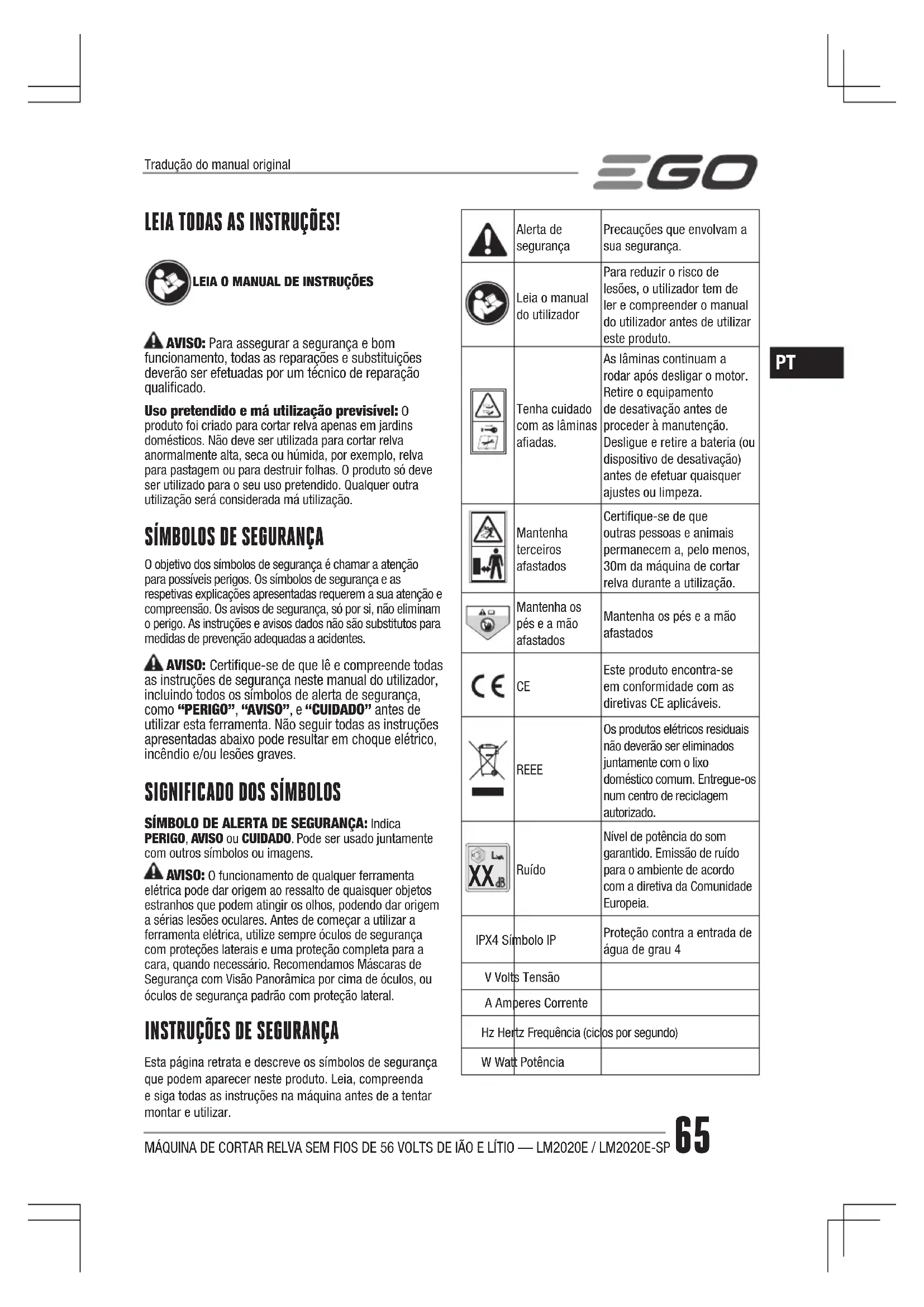 RuídoNível de potência do som garantido. Emissão de ruído para o ambiente de acordo com a diretiva da Comunidade Europeia.IPX4 Símbolo IPProteção contra a entrada de água de grau 4V Volts TensãoA Amperes CorrenteHz Hertz Frequência (ciclos por segundo)W Watt PotênciaTradução do manual originalMÁQUINA DE CORTAR RELVA SEM FIOS DE 56 VOLTS DE IÃO E LÍTIO — LM2020E / LM2020E-SP66