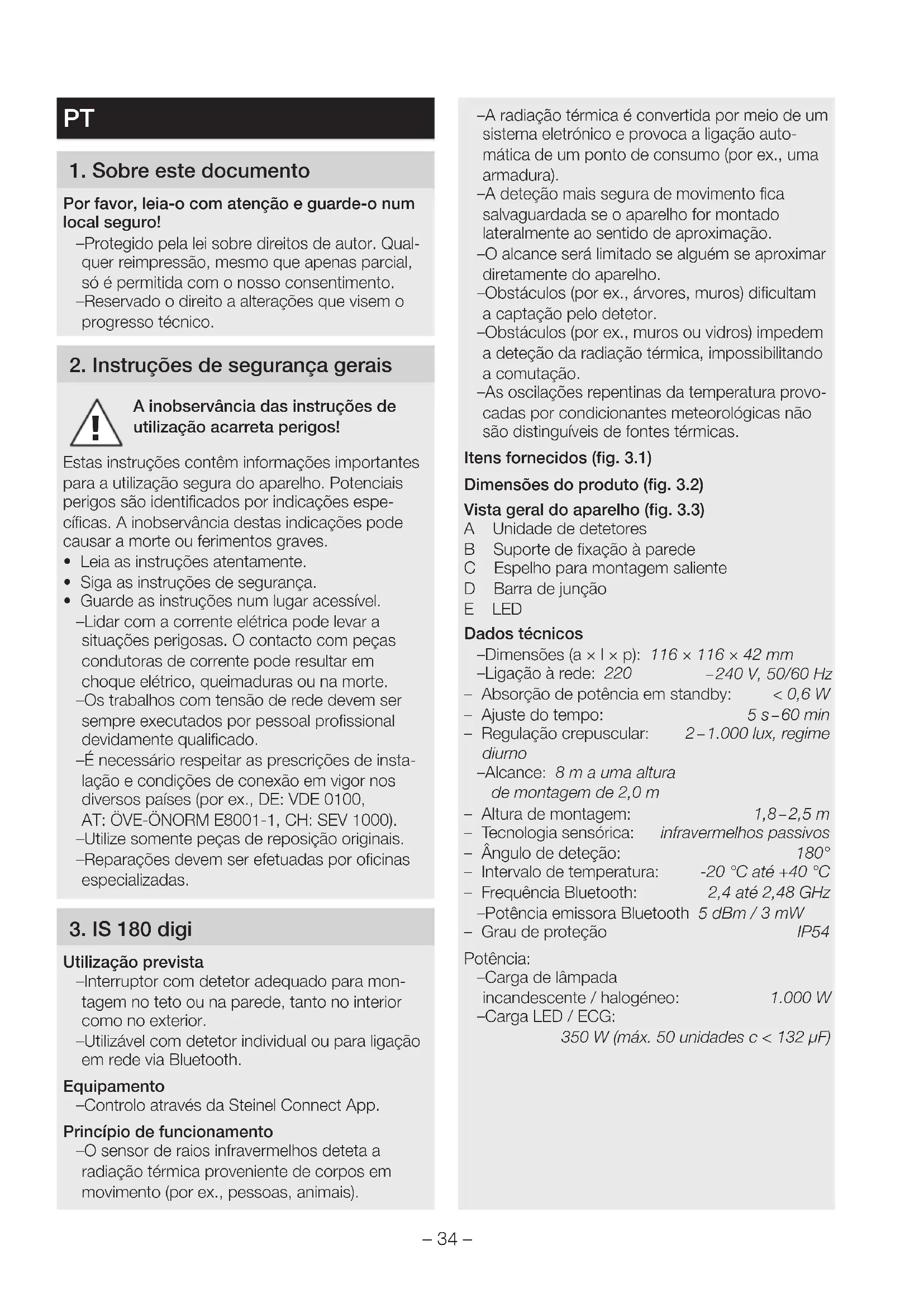 Utilização prevista – Interruptor com detetor adequado para mon- tagem no teto ou na parede, tanto no interior como no exterior. – Utilizável com detetor individual ou para ligação em rede via Bluetooth. Equipamento – Controlo através da Steinel Connect App. Princípio de funcionamento – O sensor de raios infravermelhos deteta a radiação térmica proveniente de corpos em movimento (por ex., pessoas, animais). – A radiação térmica é convertida por meio de um sistema eletrónico e provoca a ligação auto- mática de um ponto de consumo (porex., uma armadura). – A deteção mais segura de movimento fica salvaguardada se o aparelho for montado lateralmente ao sentido de aproximação. – O alcance será limitado se alguém se aproximar diretamente do aparelho. – Obstáculos (por ex., árvores, muros) dificultam a captação pelo detetor. – Obstáculos (porex., muros ou vidros) impedem a deteção da radiação térmica, impossibilitando a comutação. – As oscilações repentinas da temperatura provo- cadas por condicionantes meteorológicas não são distinguíveis de fontes térmicas. Itens fornecidos (fig.3.1) Dimensões do produto (fig.3.2) Vista geral do aparelho (fig.3.3) A Unidade de detetores B Suporte de fixação à parede C Espelho para montagem saliente D Barra de junção E LED Dados técnicos – Dimensões (a× l×p): 116×116×42mm – Ligação à rede: 220 – 240V, 50/60Hz – Absorção de potência em standby: <0,6W – Ajuste do tempo: 5s – 60min – Regulação crepuscular: 2 – 1.000lux, regime diurno – Alcance: 8m a uma altura de montagem de 2,0m – Altura de montagem: 1,8 – 2,5m – Tecnologia sensórica: infravermelhos passivos – Ângulo de deteção: 180° – Intervalo de temperatura: -20°C até +40°C – Frequência Bluetooth: 2,4 até 2,48GHz – Potência emissora Bluetooth 5dBm/3mW – Grau de proteção IP54 Potência: – Carga de lâmpada incandescente/halogéneo: 1.000W – Carga LED / ECG: 350 W (máx. 50 unidades c < 132 µF)– 35 –
