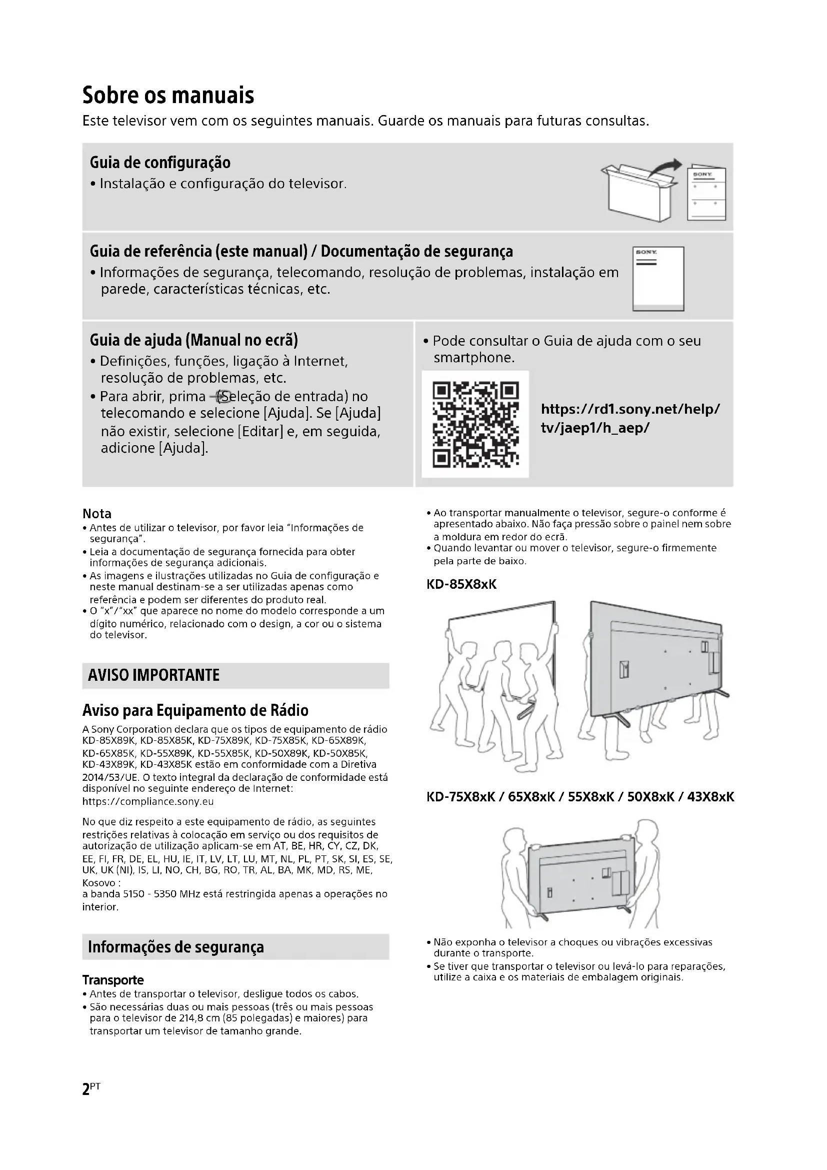 - O “x”/“xx” que aparece no nome do modelo corresponde a um dígito numérico, relacionado com o design, a cor ou o sistema do televisor. Aviso para Equipamento de Rádio A Sony Corporation declara que os tipos de equipamento de rádio KD-85X89K, KD-85X85K, KD-75X89K, KD-75X85K, KD-65X89K, KD-65X85K, KD-55X89K, KD-55X85K, KD-50X89K, KD-50X85K, KD-43X89K, KD-43X85K estão em conformidade com a Diretiva 2014/53/UE. O texto integral da declaração de conformidade está disponível no seguinte endereço de Internet: https://compliance.sony.eu No que diz respeito a este equipamento de rádio, as seguintes restrições relativas à colocação em serviço ou dos requisitos de autorização de utilização aplicam-se em AT, BE, HR, CY, CZ, DK, EE, FI, FR, DE, EL, HU, IE, IT, LV, LT, LU, MT, NL, PL, PT, SK, SI, ES, SE, UK, UK (NI), IS, LI, NO, CH, BG, RO, TR, AL, BA, MK, MD, RS, ME, Kosovo : a banda 5150 - 5350 MHz está restringida apenas a operações no interior. Transporte