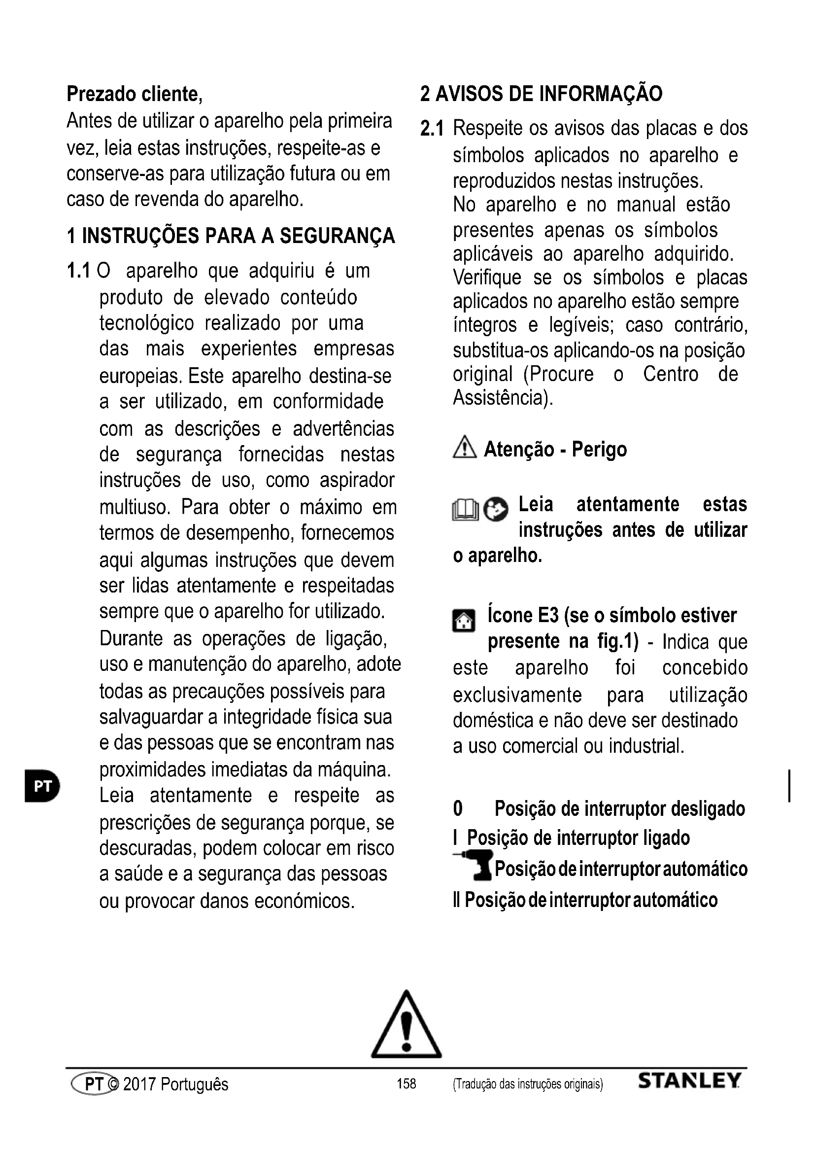 Abra o aspirador desbloqueando os ganchos (A6). Desmonte o saco ltrante (B10). Esvazie o saco ltrante, lave bem sob água a correr e deixe secar. Reinstale-o quando estiver seco. 9 ARMAZENAGEM (PÁGINA 231) Atenção - perigo! Todas as operações de instalação e montagem devem ser feitas com o aparelho desligado da rede elétrica. Ao concluir as operações, depois de limpar o aparelho, guarde o mesmo e os acessórios conforme indicado na fig.18. Conserve o aparelho em local seco. Declaração de conformidade CE Nós da Annovi Reverberi S.p.A., Modena, Itália, declaramos que a(s) seguinte(s) máquina(s) Stanley: Denominação do aparelho: Aspirador de sólidos e líquidos N.º do modelo: SXVC20PE SXVC20PTE SXVC20XTE SXVC25PTDE SXVC30XTDE SXVC35PTDE SXVC50XTDE Potência consumida: 1.2 kW 1.2 kW 1.4 kW 1.2 kW 1.6 kW 1.6 kW 1.6 kW está(ão) em conformidade com as seguintes diretivas europeias: 2014/35/UE, 2014/30/UE, 2011/65/UE, 2009/125/CE, 2012/19/EU. e é(são) produzida(s) respeitando as seguintes normas ou os seguintes documentos normalizados: EN 60335-1; EN 60335-2-2; EN 55014-1; EN 55014-2; EN 61000-3-2; EN 61000-3-3; EN 62233; EN 50581; Reg.1275/2008. Nome e endereço da pessoa encarregada da compilação do processo técnico: Stefano Reverberi / AR Managing Director Via ML King, 3 - 41122 Modena, Itália Data : 31.10.2017 MODENA (I) Stefano Reverberi Managing Director165 (Tradução das instruções originais) PT © 2017 Português