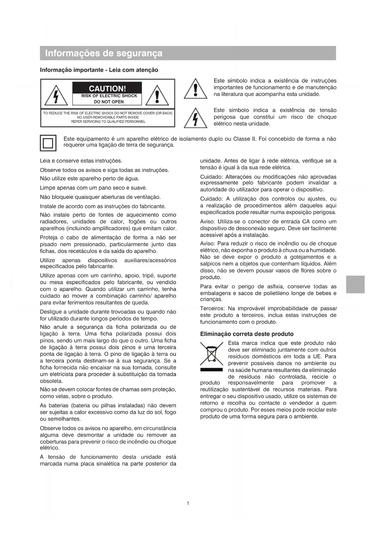 Informações de segurança Informação importante - Leia com atenção CAUTION! RISK OF ELECTRIC SHOCKDO NOT OPENTO REDUCE THE RISK OF ELECTRIC SHOCK DO NOT REMOVE COVER (OR BACK)NO USER-REMOVEABLE PARTS INSIDEREFER SERVICING TO QUALIFIED PERSONNEL Este símbolo indica a existência de instruções importantes de funcionamento e de manutenção na literatura que acompanha esta unidade. Este símbolo indica a existência de tensão perigosa que constitui um risco de choque elétrico nesta unidade. Leia e conserve estas instruções. Observe todos os avisos e siga todas as instruções. Não utilize este aparelho perto de água. Limpe apenas com um pano seco e suave. Não bloqueie quaisquer aberturas de ventilação. Instale de acordo com as instruções do fabricante. Não instale perto de fontes de aquecimento como radiadores, unidades de calor, fogões ou outros aparelhos (incluindo amplificadores) que emitam calor. Proteja o cabo de alimentação de forma a não ser pisado nem pressionado, particularmente junto das fichas, dos recetáculos e da saída do aparelho. Utilize apenas dispositivos auxiliares/acessórios especificados pelo fabricante. Utilize apenas com um carrinho, apoio, tripé, suporte ou mesa especificados pelo fabricante, ou vendido com o aparelho. Quando utilizar um carrinho, tenha cuidado ao mover a combinação carrinho/ aparelho para evitar ferimentos resultantes de queda. Desligue a unidade durante trovoadas ou quando não for utilizado durante longos períodos de tempo. Não anule a segurança da ficha polarizada ou de ligação à terra. Uma ficha polarizada possui dois pinos, sendo um mais largo do que o outro. Uma ficha de ligação à terra possui dois pinos e uma terceira ponta de ligação à terra. O pino de ligação à terra ou a terceira ponta destinam-se à sua segurança. Se a ficha fornecida não encaixar na sua tomada, consulte um eletricista para proceder à substituição da tomada obsoleta. Não se devem colocar fontes de chamas sem proteção, como velas, sobre o produto. As baterias (bateria ou pilhas instaladas) não devem ser sujeitas a calor excessivo como da luz do sol, fogo ou semelhantes. Observe todos os avisos no aparelho, em circunstância alguma deve desmontar a unidade ou remover as coberturas para prevenir o risco de incêndio ou choque elétrico. A tensão de funcionamento desta unidade está marcada numa placa sinalética na parte posterior da unidade. Antes de ligar à rede elétrica, verifique se a tensão é igual à da sua rede elétrica. Cuidado: Alterações ou modificações não aprovadas expressamente pelo fabricante podem invalidar a autoridade do utilizador para operar o dispositivo. Cuidado: A utilização dos controlos ou ajustes, ou a realização de procedimentos além daqueles aqui especificados pode resultar numa exposição perigosa. Aviso: Utiliza-se o conector de entrada CA como um dispositivo de desconexão seguro. Deve ser facilmente acessível após a instalação. Aviso: Para reduzir o risco de incêndio ou de choque elétrico, não exponha o produto à chuva ou a humidade. Não se deve expor o produto a gotejamentos e a salpicos nem a objetos que contenham líquidos. Além disso, não se devem pousar vasos de flores sobre o produto. Para evitar o perigo de asfixia, conserve todas as embalagens e sacos de polietileno longe de bebes e crianças. Terceiros: Na improvável improbabilidade de passar este produto a terceiros, inclua estas instruções de funcionamento com o produto. Eliminação correta deste produto Esta marca indica que este produto não deve ser eliminado juntamente com outros resíduos domésticos em toda a UE. Para prevenir possíveis danos no ambiente ou na saúde humana resultantes da eliminação de resíduos não controlada, recicle o produto responsavelmente para promover a reutilização sustentável de recursos materiais. Para entregar o seu dispositivo usado, utilize os sistemas de retorno e recolha ou contacte o vendedor a quem comprou o produto. Por esses meios pode reciclar este produto de uma forma segura para o ambiente. Este equipamento é um aparelho elétrico de isolamento duplo ou Classe II. Foi concebido de forma a não requerer uma ligação de terra de segurança.2
