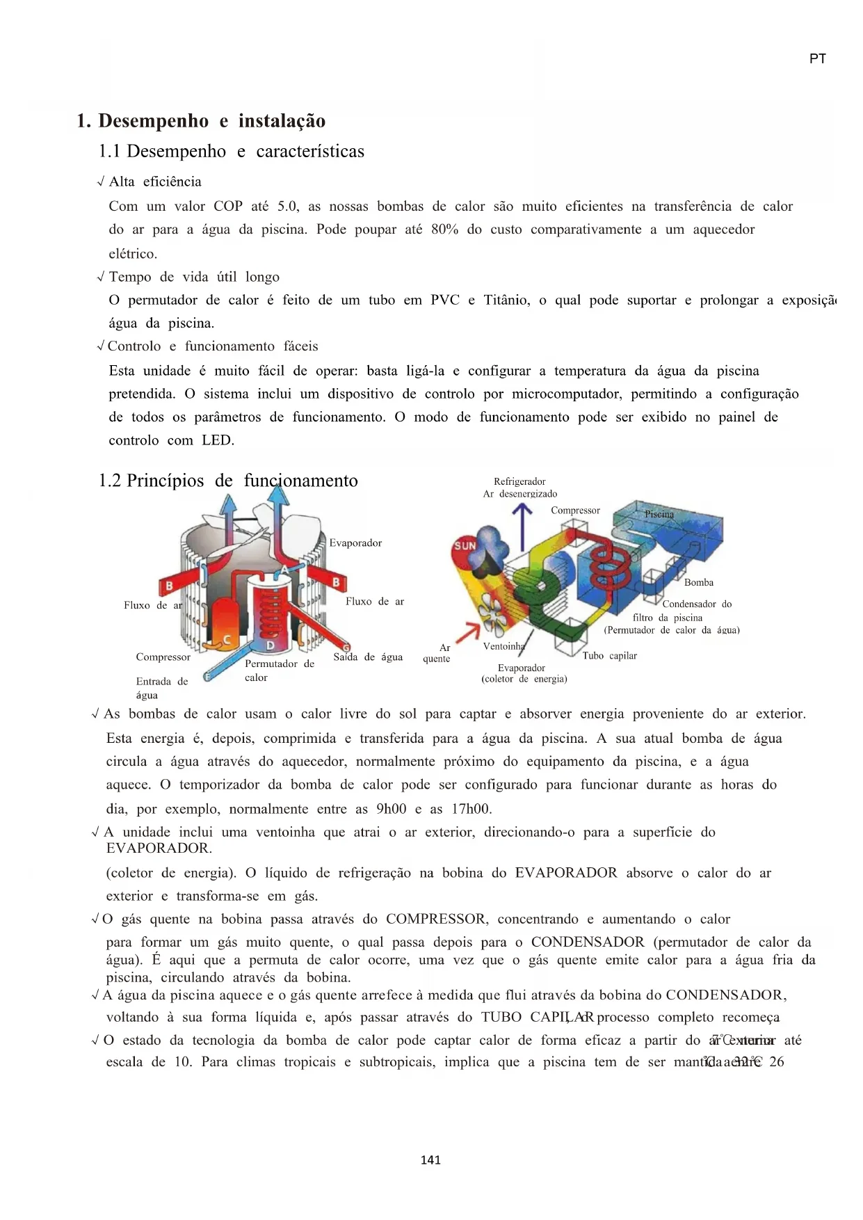 Tempo de vida útil longo O permutador de calor é feito de um tubo em PVC e Titânio, o qual pode suportar e prolongar a exposição à água da piscina. √Controlo e funcionamento fáceis Esta unidade é muito fácil de operar: basta ligá-la e configurar a temperatura da água da piscina pretendida. O sistema inclui um dispositivo de controlo por microcomputador, permitindo a configuração de todos os parâmetros de funcionamento. O modo de funcionamento pode ser exibido no painel de controlo com LED.