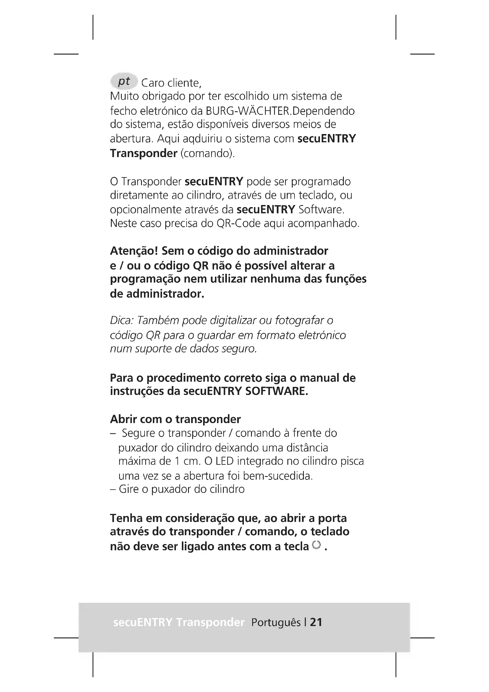 MANUAL DE UTILIZADOR Entry 5710 Transponder Burg Wächter