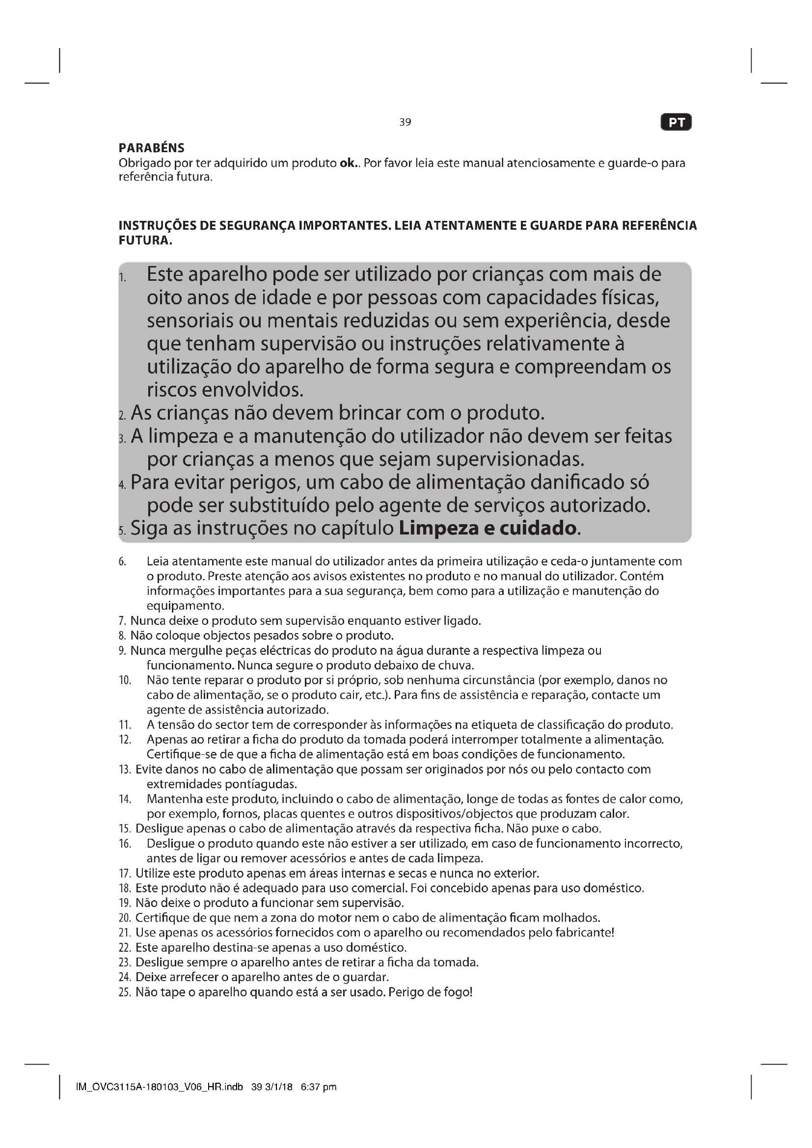 PARABÉNS Obrigado por ter adquirido um produto ok.. Por favor leia este manual atenciosamente e guarde-o para referência futura. INSTRUÇÕES DE SEGURANÇA IMPORTANTES. LEIA ATENTAMENTE E GUARDE PARA REFERÊNCIA FUTURA.