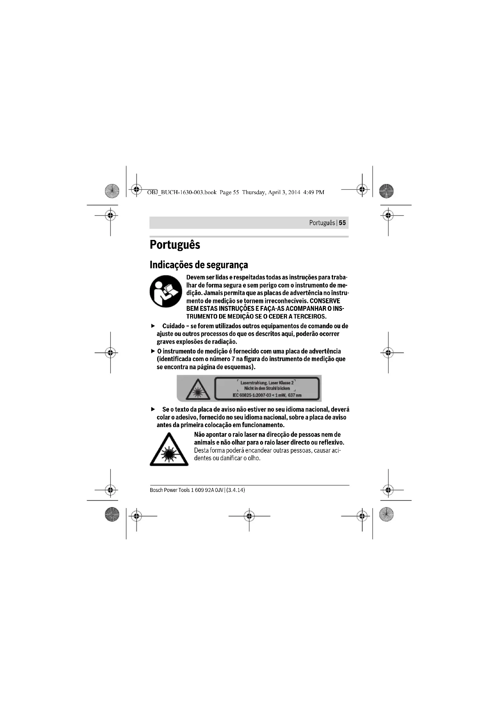 Proteger o instrumento de medição contra humidade ou insolação directa. Não sujeitar o instrumento de medição a temperaturas extremas nem a oscilações de temperatura. Não deixá-lo p.ex. dentro de um automóvel du- rante muito tempo. No caso de grandes variações de temperatura deverá dei- OBJ_BUCH-1630-003.book Page 59 Thursday, April 3, 2014 4:49 PM1 609 92A 0JV | (3.4.14) Bosch Power Tools 60 | Português xar o instrumento de medição alcançar a temperatura de funcionamento an- tes de colocá-lo em funcionamento. No caso de temperaturas ou de oscilações de temperatura extremas é possível que a precisão do instrumen- to de medição seja prejudicada. Evitar que o instrumento de medição sofra fortes golpes ou quedas. Da- nos no instrumento de medição podem prejudicar a sua exactidão. Após im- pactos fortes ou quedas deverá controlar a linha do laser, comparando-a com uma linha de referência conhecida, vertical ou horizontal. Desligue o instrumento de medição antes de transportá-lo. A unidade de nivelamento é bloqueada logo que o instrumento for desligado, caso contrá- rio poderia ser danificada devido a fortes movimentos. Ligar e desligar Para ligar o instrumento de medição é necessário deslocar o interruptor de li- gar/desligar 2 para cima. O instrumento de medição envia imediatamente, de- pois de ser ligado, duas linhas de laser a partir da abertura de saída 1. Não apontar o raio laser na direcção de pessoas nem de animais, e não olhar no raio laser, nem mesmo de maiores distâncias. Para desligar o instrumento de medição é necessário empurrar o interruptor de ligar/desligar 2 para baixo, além da abertura da saída do laser 1. A unidade pen- dular é travada ao desligar. Não deixar o instrumento de medição ligado sem vigilância e desligar o instrumento de medição após a utilização. Outras pessoas poderiam ser cegadas pelo raio laser. Se o instrumento de medição não for utilizado, desligue-o para poupar energia. Nivelamento automático Para trabalhar com o nivelamento automático é necessário colocar o instrumen- to de medição sobre uma superfície horizontal e firme, fixá-lo no suporte 12 ou no tripé 14. OBJ_BUCH-1630-003.book Page 60 Thursday, April 3, 2014 4:49 PMPortuguês | 61 Bosch Power Tools 1 609 92A 0JV | (3.4.14) Depois de desligar, o nivelamento automático compensa automaticamente os desníveis dentro da faixa de nivelamento automático do ±4°. O nivelamento es- tá encerrado assim que as linhas de laser não se movimentarem mais e o aviso da pilha e o aviso do nivelamento 3 não piscarem mais. Se o nivelamento automático não for possível, por ex. por que o lado de baixo do instrumento de medição diverge mais do que 4° da linha horizontal ou se o aviso da pilha ou o aviso do nivelamento 3 em vermelho e o instrumento de medição trabalha sem o nivelamento automático. As linhas de laser permanecem ligadas, as duas linhas cruzadas percorrem necessariamente num ângulo recto. Nota: O trabalho sem nivelamento automático é sempre indicado pelo aviso in- termitente da pilha e do nivelamento 3, independente do estado da pilha. Para trabalhar com o nivelamento automático é necessário posicionar o instru- mento de medição de modo que o lado inferior esteja alinhado horizontalmente e aguardar o nivelamento automático. Assim que o instrumento de medição es- tiver dentro da faixa de nivelamento automático ±4°, o aviso da pilha e do nive- lamento 3 não pisca mais (quando as pilhas estão fracas ela está permanente- mente iluminada, caso contrário ela se apaga). O instrumento de medição é automaticamente renivelado se ocorrerem abalos ou mudanças de posição durante o funcionamento. Após um renivelamento, de- verá controlar a posição da linha de laser horizontal ou da vertical em relação aos pontos de referência, para evitar erros. Indicações de trabalho Para marcar, só deve ser utilizado o centro da linha de laser. A largura da linha de laser modifica-se com a distância. Fixar com o dispositivo de fixação (veja figura A) Com ajuda do suporte 12 é possível fixar o instrumento de medição a diversos objectos, com uma espessura de 10 a 60 mm, por ex. a tábuas ou tubos verticais e horizontais. OBJ_BUCH-1630-003.book Page 61 Thursday, April 3, 2014 4:49 PM1 609 92A 0JV | (3.4.14) Bosch Power Tools 62 | Português Soltar o parafuso de fixação 11 do suporte, colocar o suporte no local desejado e reapertar o parafuso de fixação. Para a fixação do instrumento de medição no suporte 12 é possível seleccionar entre as seguintes possibilidades: – Atarraxar a placa de adaptação 8 no parafuso de 1/4" 9 do suporte e apertar com força moderada no suporte. Pressionar o instrumento de medição na placa de adaptação, de modo que os travamentos da placa de adaptação en- gate nos entalhes dos dois lados do instrumento de medição. Verificar se o instrumento está bem firme. – Colocar o instrumento de medição com o tripé 4 sobre o parafuso de 1/4" 9 do suporte e apertar com força moderada sobre o suporte. Não apertar de- masiadamente o instrumento de medição, caso contrário ele pode ser danifi- cado. Alinhar aproximadamente o suporte antes de ligar o instrumento de medição. Para isto deverá soltar o parafuso de fixação 10 do suporte e movimentar o ins- trumento de medição em uma posição horizontal, na altura desejada. Reapertar o parafuso de fixação. Trabalhar com o tripé (acessório) O tripé é um suporte de medição estável e com altura regulável. Colocar o instru- mento de medição com a admissão do tripé 4 sobre a rosca de 1/4" do tripé e atarraxar com o parafuso de fixação do tripé. Para retirar rapidamente o instrumento de medição rapidamente no tripé e reco- locá-lo, é possível usar a placa de adaptação 8 do suporte 12. Para tal é neces- sário atarraxar a placa de adaptação com o parafuso de fixação do tripé e permi- tir q