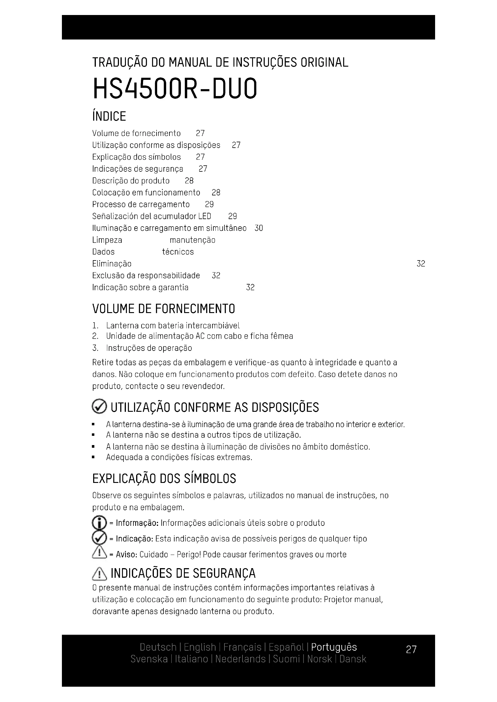 Antes de utilizar a sua lanterna pela primeira vez, leia atentamente este manual de instruções e proceda em conformidade. Guarde este manual de instruções para utilização posterior ou para o proprietário subsequente. Em caso de inobservância deste manual de instruções e das indicações de segurança, podem ocorrer danos no produto e riscos (ferimentos) para o utilizador e outras pessoas.