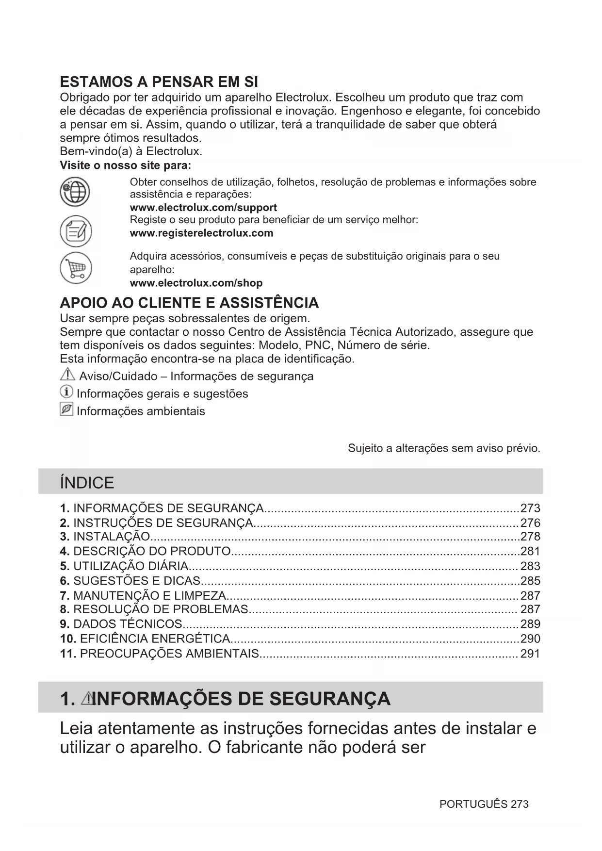 Obrigado por ter adquirido um aparelho Electrolux. Escolheu um produto que traz com ele décadas de experiência profissional e inovação. Engenhoso e elegante, foi concebido a pensar em si. Assim, quando o utilizar, terá a tranquilidade de saber que obterá sempre ótimos resultados. Bem-vindo(a) à Electrolux. Visite o nosso site para:Obter conselhos de utilização, folhetos, resolução de problemas e informações sobreassistência e reparações:www.electrolux.com/supportRegiste o seu produto para beneficiar de um serviço melhor:www.registerelectrolux.comAdquira acessórios, consumíveis e peças de substituição originais para o seuaparelho:www.electrolux.com/shop