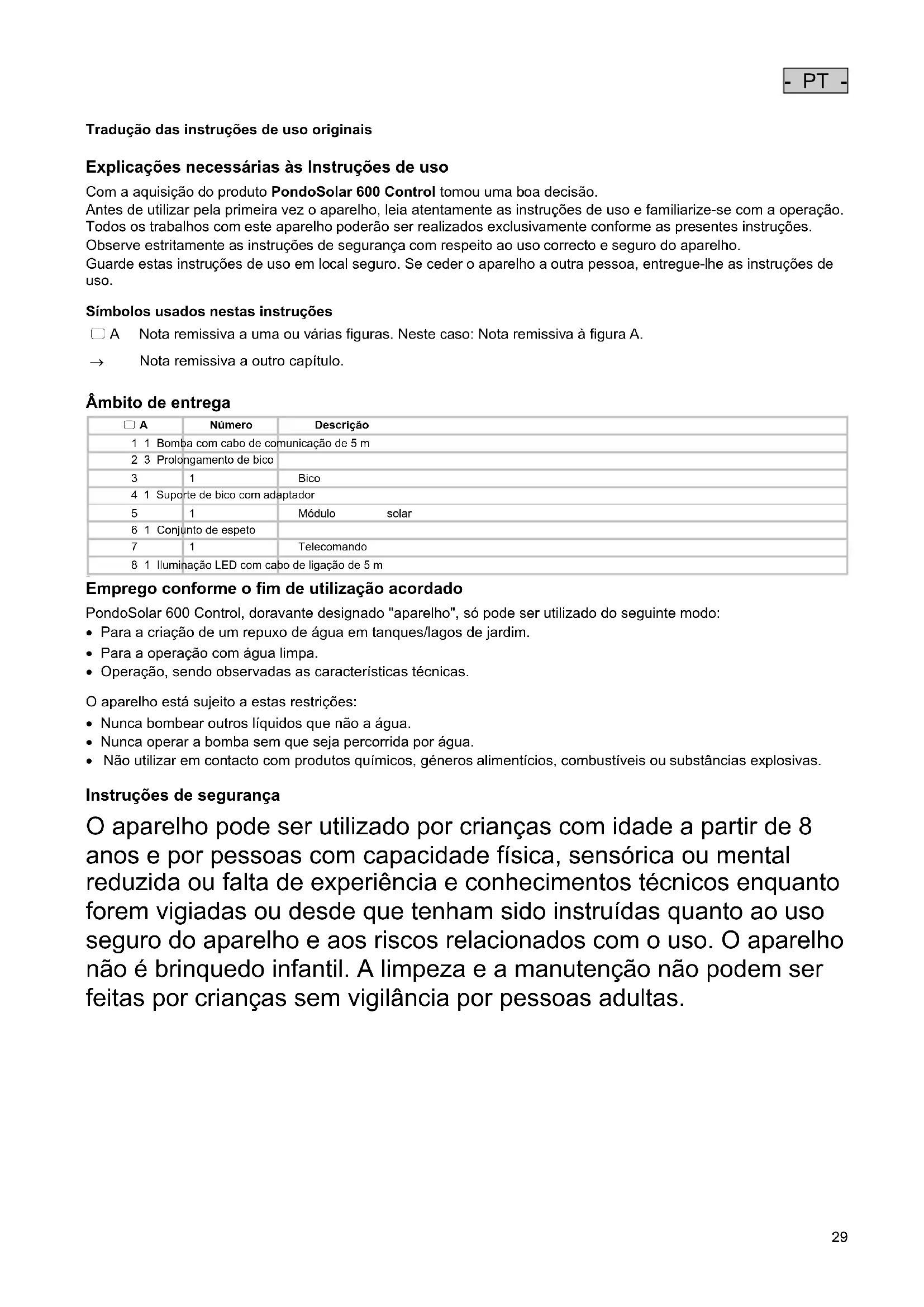 Emprego conforme o fim de utilização acordado PondoSolar 600 Control, doravante designado "aparelho", só pode ser utilizado do seguinte modo: Para a criação de um repuxo de água em tanques/lagos de jardim. Para a operação com água limpa. Operação, sendo observadas as características técnicas.