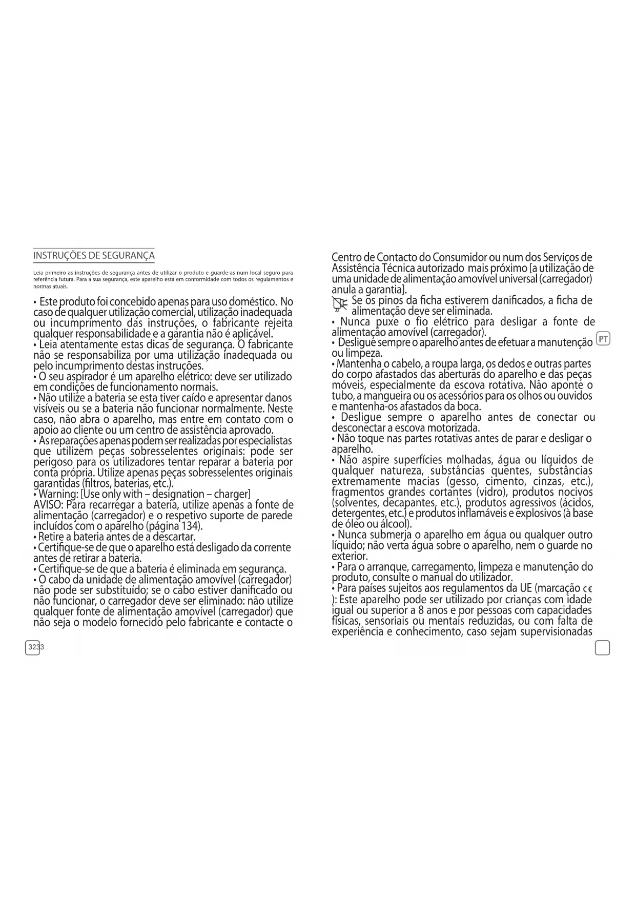 - O cabo da unidade de alimentação amovível (carregador) não pode ser substituído; se o cabo estiver danicado ou não funcionar, o carregador deve ser eliminado: não utilize qualquer fonte de alimentação amovível (carregador) que não seja o modelo fornecido pelo fabricante e contacte o Centro de Contacto do Consumidor ou num dos Serviços de Assistência Técnica autorizado mais próximo [a utilização de uma unidade de alimentação amovível universal (carregador) anula a garantia]. Se os pinos da cha estiverem danicados, a cha de alimentação deve ser eliminada.