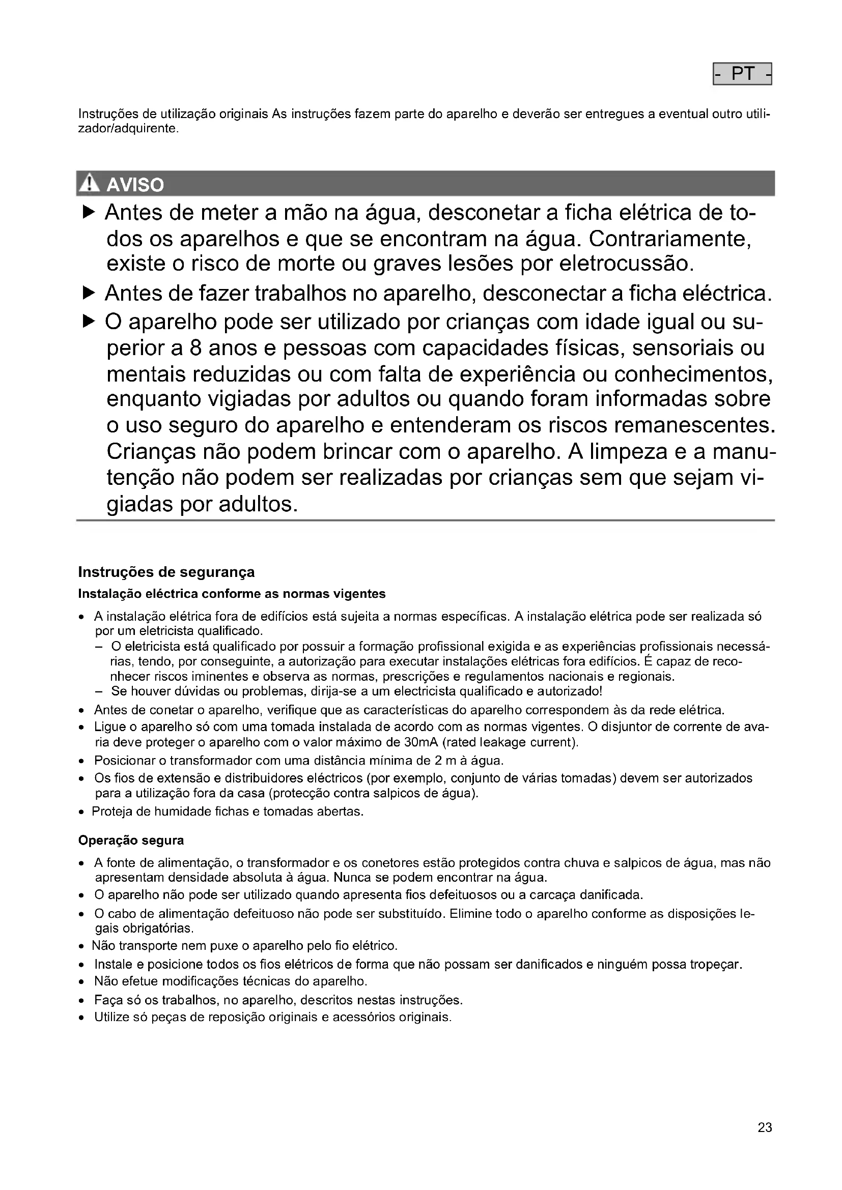 AVISO AVISO Antes de meter a mão na água, desconetar a ficha elétrica de to- dos os aparelhos e que se encontram na água. Contrariamente, existe o risco de morte ou graves lesões por eletrocussão. Antes de fazer trabalhos no aparelho, desconectar a ficha eléctrica. O aparelho pode ser utilizado por crianças com idade igual ou su- perior a 8 anos e pessoas com capacidades físicas, sensoriais ou mentais reduzidas ou com falta de experiência ou conhecimentos, enquanto vigiadas por adultos ou quando foram informadas sobre o uso seguro do aparelho e entenderam os riscos remanescentes. Crianças não podem brincar com o aparelho. A limpeza e a manu- tenção não podem ser realizadas por crianças sem que sejam vi- giadas por adultos.