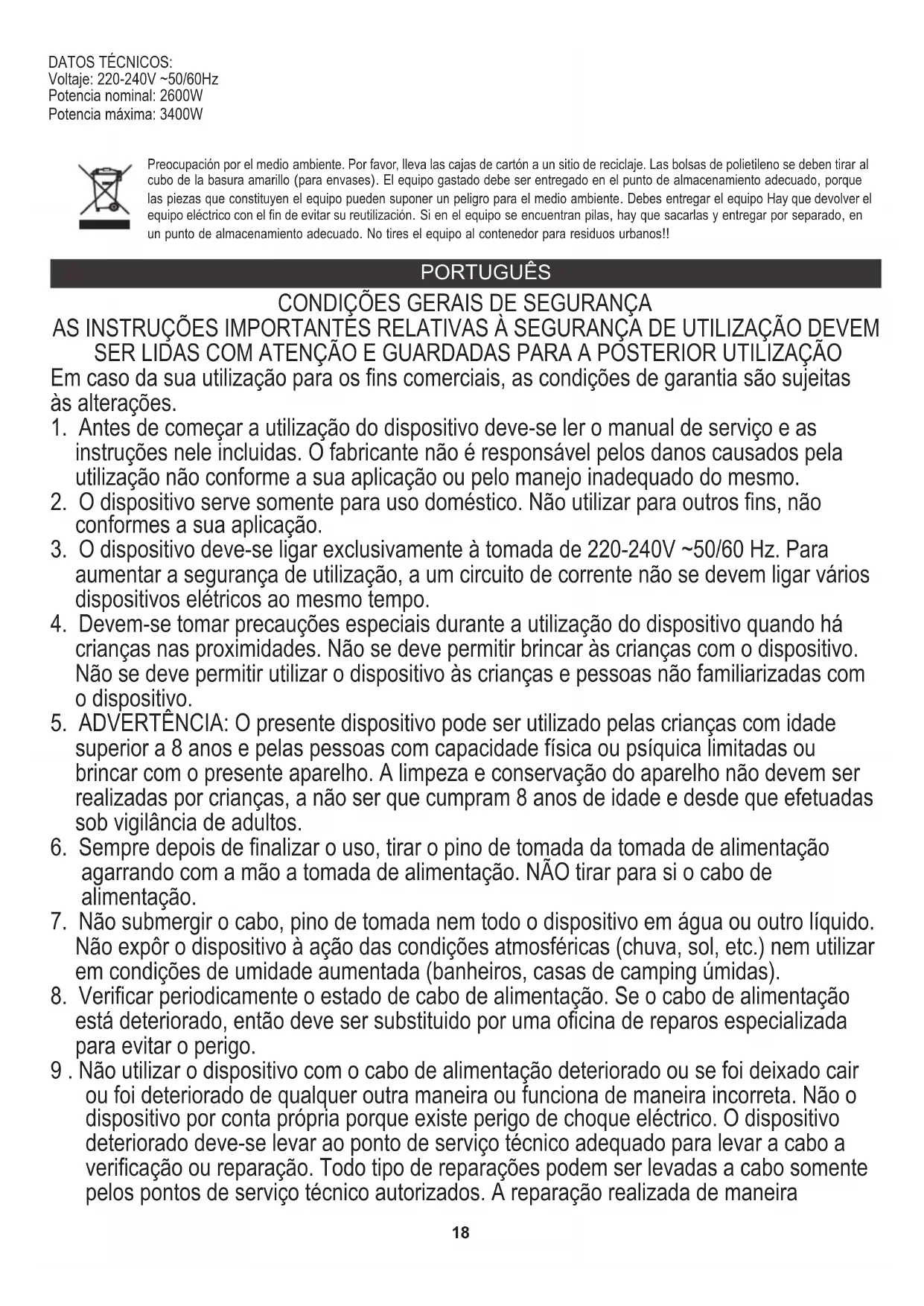 DADOS TÉCNICOS: Potência Nom.: 2600W Não colocar o dispositivo em contenedores para resíduos municipais!! Protecção do meio ambiente. Rogamos, os embalagens de cartão destinem-se para papéis velhos. Os sacos de polietileno (PE) devem-se colocar em contenedores para material plástico. O dispositivo usado deve-se levar a um ponto de armazenamento adequado porque os componentes perigosos que ficam dentro do dispositivo podem ser perigosos para o meio ambiente. O dispositivo elétrico deve-se entregar de modo que se reduza a sua nova utilização e uso. Se no dispositivo há pilhas, devem-se tirar e levar a um ponto de armazenamento em separado. 21SAUGOS SĄLYGOS. SVARBŪS NAUDOJIMO SAUGOS INSTRUKCIJOS PRAŠOME ATSITIKTINIAI ATSISKAITYTI IR ATSIŽVELGTI Į BŪSIMĄ REFERENCE Garantijos sąlygos skiriasi, jei prietaisas naudojamas komerciniais tikslais.