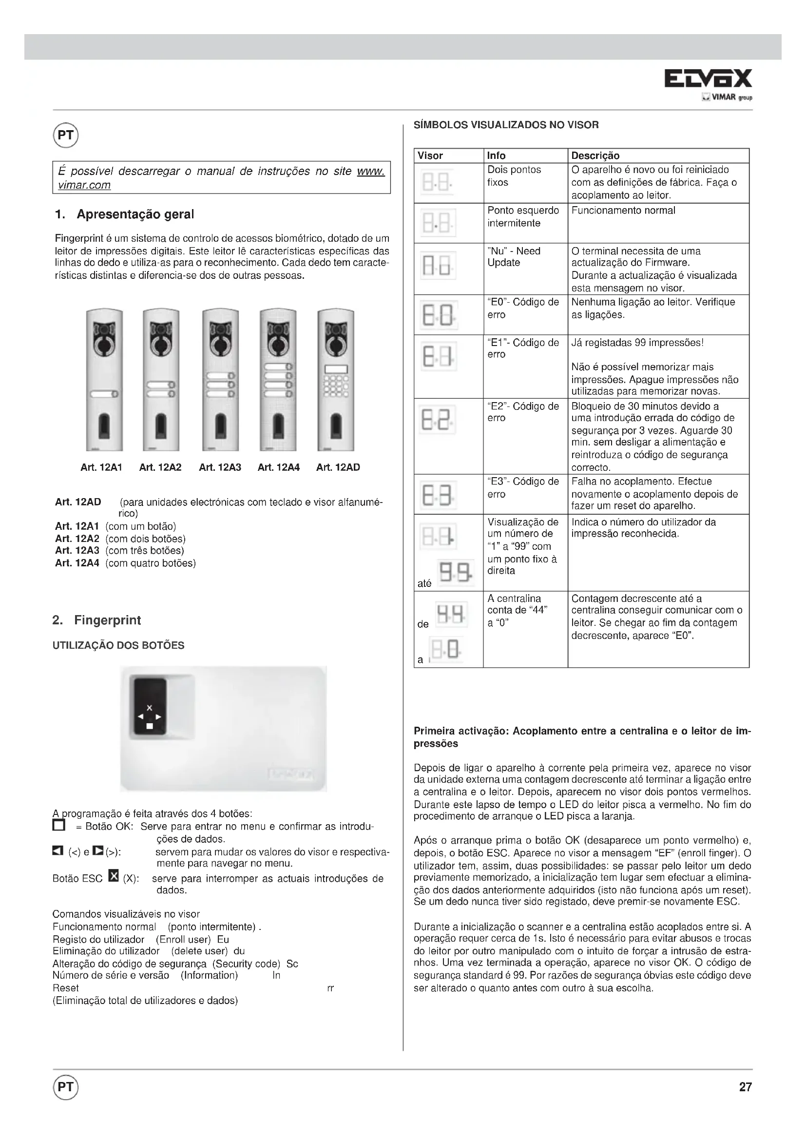 Fingerprint é um sistema de controlo de acessos biométrico, dotado de um leitor de impressões digitais. Este leitor lê características específicas das linhas do dedo e utiliza-as para o reconhecimento. Cada dedo tem caracte- rísticas distintas e diferencia-se dos de outras pessoas. Art. 12AD (para unidades electrónicas com teclado e visor alfanumé- rico) Art. 12A1 (com um botão) Art. 12A2 (com dois botões) Art. 12A3 (com três botões) Art. 12A4 (com quatro botões) Art. 12A1 Art. 12A2 Art. 12A3 Art. 12A4 Art. 12AD