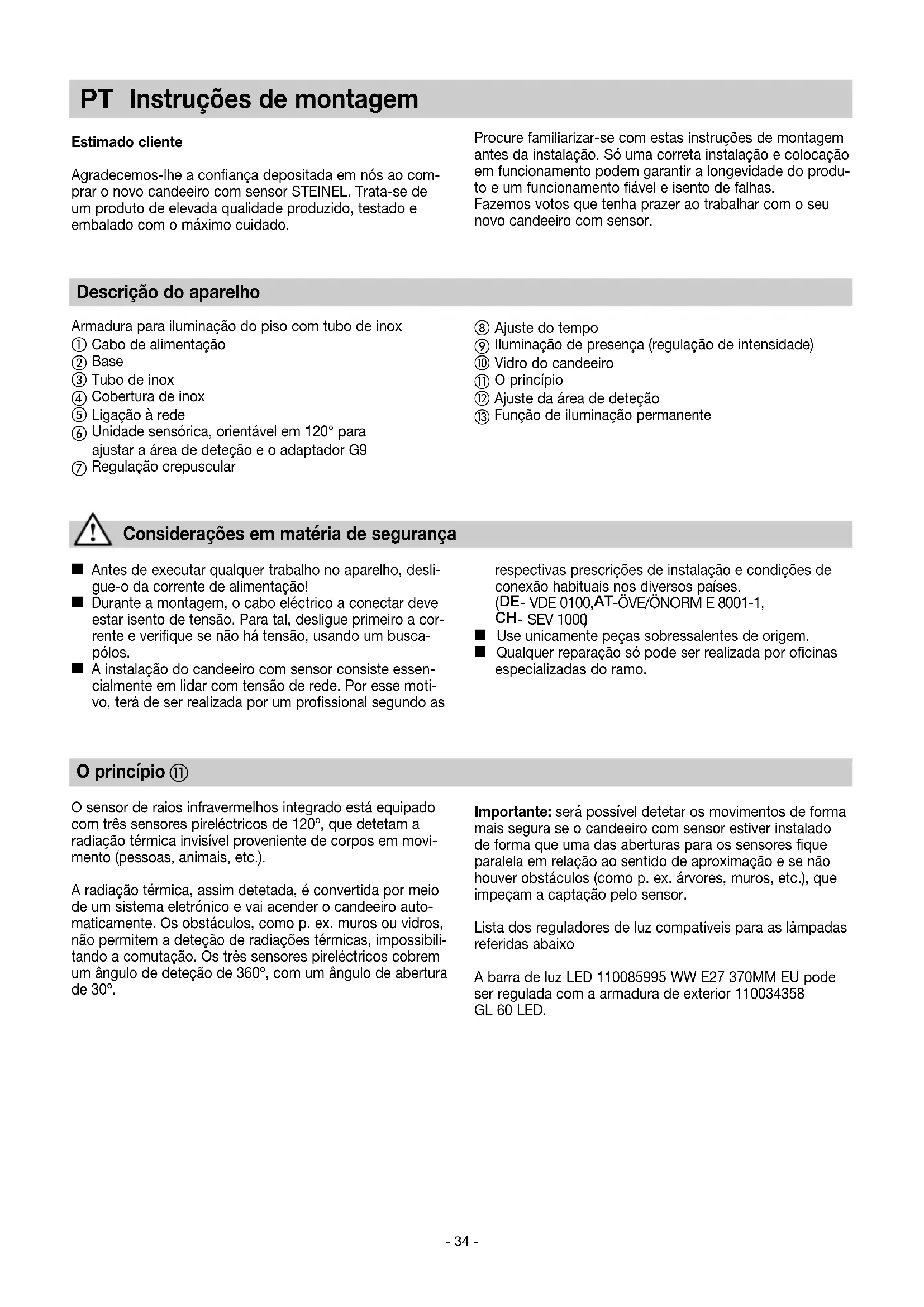 Instruções de montagem Estimado cliente Agradecemos-lhe a confiança depositada em nós ao com- prar o novo candeeiro com sensor STEINEL. Trata-se de um produto de elevada qualidade produzido, testado e embalado com o máximo cuidado. Considerações em matéria de segurança