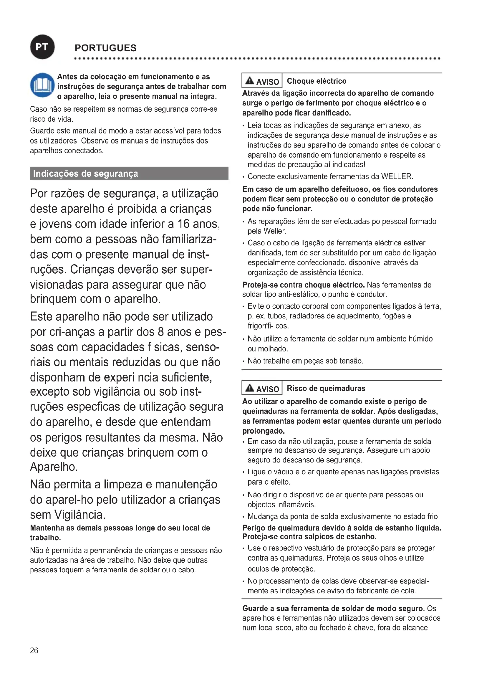 soas com capacidades f sicas, senso- riais ou mentais reduzidas ou que não disponham de experi ncia suciente, excepto sob vigilância ou sob inst- ruções especcas de utilização segura do aparelho, e desde que entendam os perigos resultantes da mesma. Não deixe que crianças brinquem com o Aparelho. Não permita a limpeza e manutenção do aparel-ho pelo utilizador a crianças sem Vigilância. Mantenha as demais pessoas longe do seu local de trabalho. Não é permitida a permanência de crianças e pessoas não autorizadas na área de trabalho. Não deixe que outras pessoas toquem a ferramenta de soldar ou o cabo. AVISO Choque eléctrico Através da ligação incorrecta do aparelho de comando surge o perigo de ferimento por choque eléctrico e o aparelho pode car danicado.