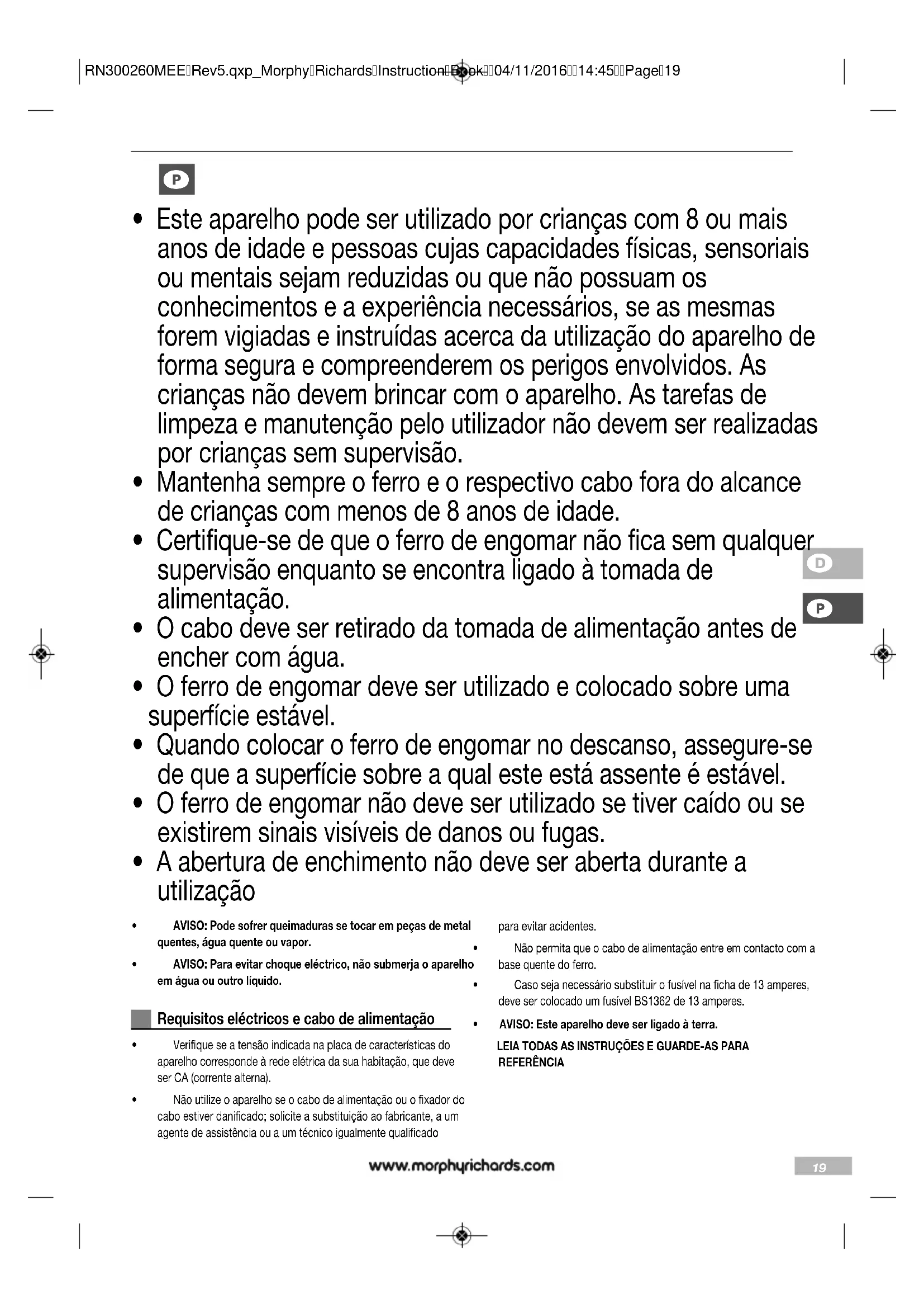 4 Ligue a uma tomada de alimentação. 5 Defina o interruptor de temperatura (9) para “MAX”. Consulte o passo 2 de “Utilizar o ferro para engomar a vapor”. 6 A luz indicadora de temperatura (10) irá acender até atingir a temperatura pretendida e depois desliga-se. Aguarde mais um ciclo - a luz indicadora de temperatura acende e depois apaga-se. 7 Desligue o ferro da tomada de alimentação. 8 Enquanto o ferro permanecer muito quente, coloque o ferro na horizontal por cima de uma banca de cozinha. 9 Enquanto mantém premido o interruptor de vapor variável (1) na posição de limpeza automática, desloque o ferro com cuidado para trás e para a fente até o depósito de água estar vazio. AVISO: O vapor e a água quente a ferver irá sair pelas aberturas na placa base. Isto permite drenar o calcário e minerais acumulados no interior da câmara de vapor. 10 Quando a limpeza terminar, coloque o interruptor de vapor variável de novo para a posição “O”. 11 Coloque o ferro a vapor novamente no descanso e deixe arrefecer totalmente. 12 Limpe a placa base (6) com um pano húmido e frio. Após a operação de limpeza, esvazie qualquer água restante. AVISO: Mantenha as mãos e o corpo afastados da água quente. AVISO: Não tente descalcificar a placa base com produtos de descalcificação. Contacto Linha de atendimento Se tiver qualquer problema com o seu aparelho, contacte a nossa Linha de atendimento. Provavelmente, poderemos ajudá- lo mais do que a loja onde adquiriu o aparelho. Quando entrar em contacto connosco sobre quaisquer dúvidas, deve ter o nome do produto, o número do modelo e o número de série disponíveis. Fale connosco Se tiver quaisquer questões ou comentários ou se desejar obter sugestões para tirar o maior partido dos nossos produtos, visite-nos online: Blogue: www.morphyrichards.co.uk/blog Facebook: www.facebook.com/morphyrichardsuk Twitter: www.twitter.com/loveyourmorphy Website: www.morphyrichards.com