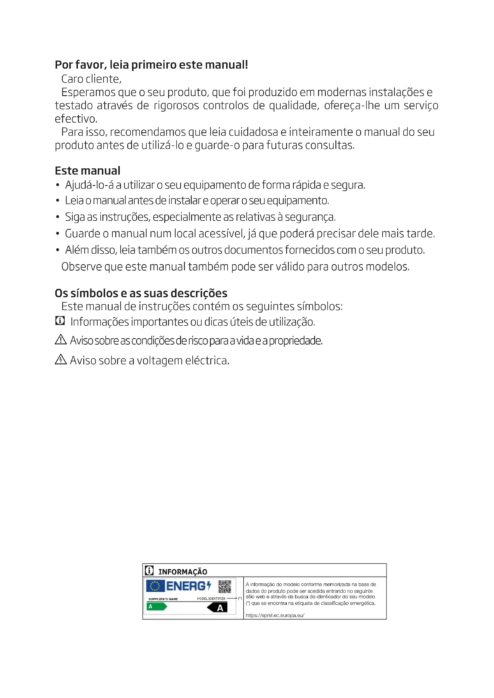 A informação do modelo conforme memorizada na base de dados do produto pode ser acedida entrando no seguinte sítio web e através da busca do identicador do seu modelo (*) que se encontra na etiqueta de classificação emergética.https://eprel.ec.europa.eu/
