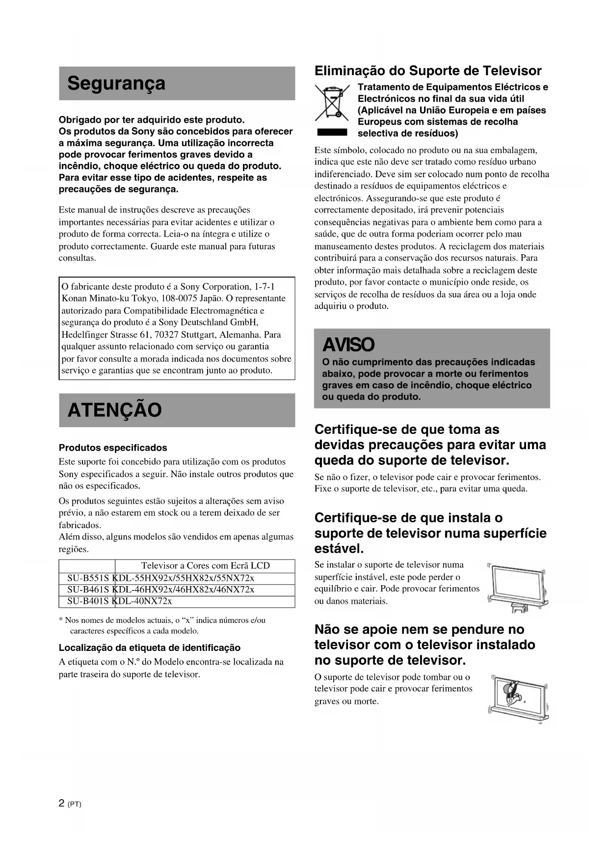 - Nos nomes de modelos actuais, o “x” indica números e/ou caracteres específicos a cada modelo. Localização da etiqueta de identificação A etiqueta com o N.º do Modelo encontra-se localizada na parte traseira do suporte de televisor. Eliminação do Suporte de Televisor Tratamento de Equipamentos Eléctricos e Electrónicos no final da sua vida útil (Aplicável na União Europeia e em países Europeus com sistemas de recolha selectiva de resíduos) Este símbolo, colocado no produto ou na sua embalagem, indica que este não deve ser tratado como resíduo urbano indiferenciado. Deve sim ser colocado num ponto de recolha destinado a resíduos de equipamentos eléctricos e electrónicos. Assegurando-se que este produto é correctamente depositado, irá prevenir potenciais consequências negativas para o ambiente bem como para a saúde, que de outra forma poderiam ocorrer pelo mau manuseamento destes produtos. A reciclagem dos materiais contribuirá para a conservação dos recursos naturais. Para obter informação mais detalhada sobre a reciclagem deste produto, por favor contacte o município onde reside, os serviços de recolha de resíduos da sua área ou a loja onde adquiriu o produto. Certifique-se de que toma as devidas precauções para evitar uma queda do suporte de televisor. Se não o fizer, o televisor pode cair e provocar ferimentos. Fixe o suporte de televisor, etc., para evitar uma queda. Certifique-se de que instala o suporte de televisor numa superfície estável. Se instalar o suporte de televisor numa superfície instável, este pode perder o equilíbrio e cair. Pode provocar ferimentos ou danos materiais. Não se apoie nem se pendure no televisor com o televisor instalado no suporte de televisor. O suporte de televisor pode tombar ou o televisor pode cair e provocar ferimentos graves ou morte. Segurança O fabricante deste produto é a Sony Corporation, 1-7-1 Konan Minato-ku Tokyo, 108-0075 Japão. O representante autorizado para Compatibilidade Electromagnética e segurança do produto é a Sony Deutschland GmbH, Hedelfinger Strasse 61, 70327 Stuttgart, Alemanha. Para qualquer assunto relacionado com serviço ou garantia por favor consulte a morada indicada nos documentos sobre serviço e garantias que se encontram junto ao produto. ATENÇÃO Televisor a Cores com Ecrã LCD SU-B551S KDL-55HX92x/55HX82x/55NX72x SU-B461S KDL-46HX92x/46HX82x/46NX72x SU-B401S KDL-40NX72x AVISO O não cumprimento das precauções indicadas abaixo, pode provocar a morte ou ferimentos graves em caso de incêndio, choque eléctrico ou queda do produto.3 (PT) Não tape as aberturas de ventilação do televisor. As aberturas de ventilação do televisor são necessárias para assegurar um funcionamento fiável do televisor e para o proteger contra sobreaquecimento.