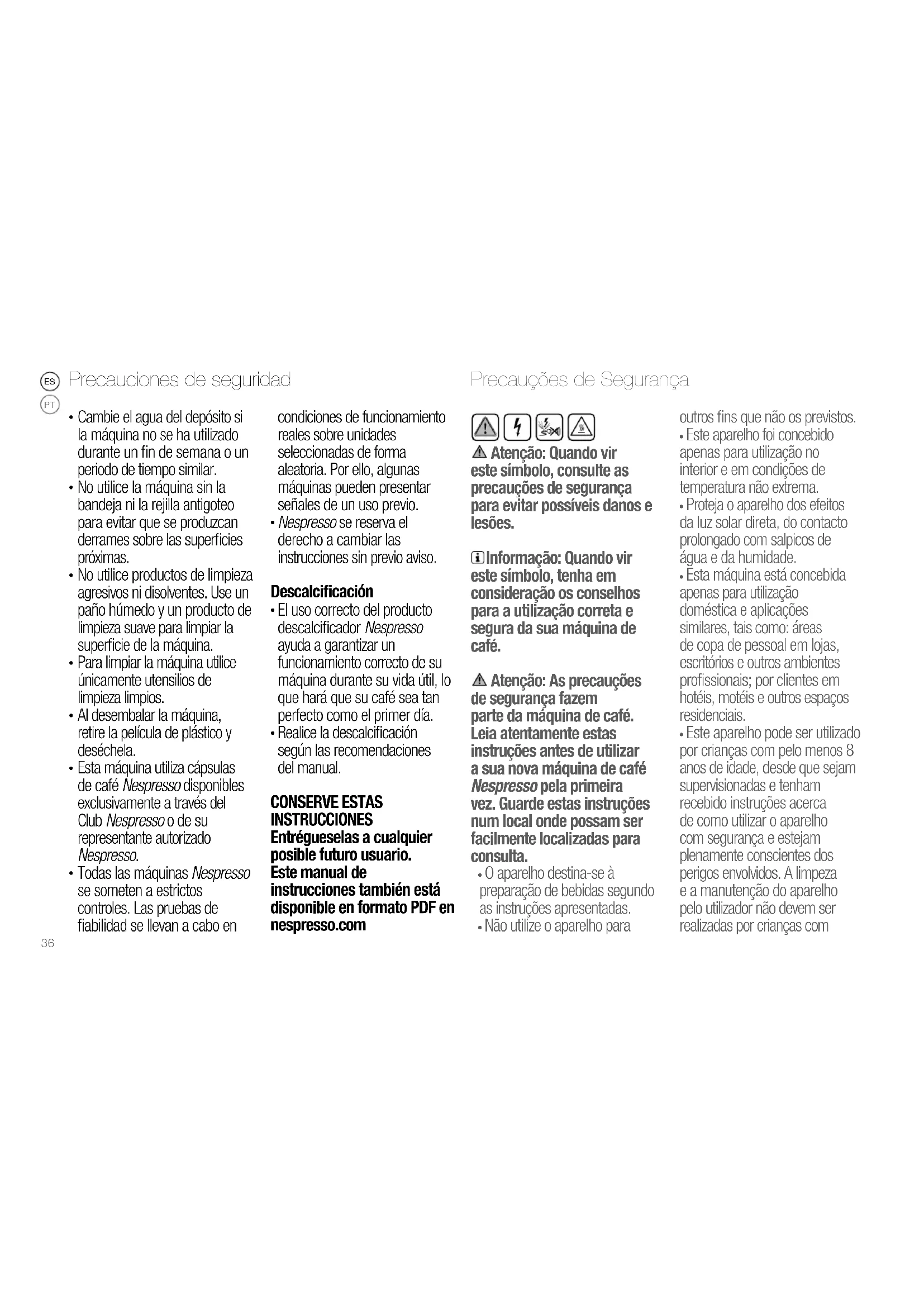 Realice la descalcificación según las recomendaciones del manual. CONSERVE ESTAS INSTRUCCIONES Entrégueselas a cualquier posible futuro usuario. Este manual de instrucciones también está disponible en formato PDF en nespresso.com Atenção: Quando vir este símbolo, consulte as precauções de segurança para evitar possíveis danos e lesões. Informação: Quando vir este símbolo, tenha em consideração os conselhos para a utilização correta e segura da sua máquina de café. Atenção: As precauções de segurança fazem parte da máquina de café. Leia atentamente estas instruções antes de utilizar a sua nova máquina de café Nespresso pela primeira vez. Guarde estas instruções num local onde possam ser facilmente localizadas para consulta.