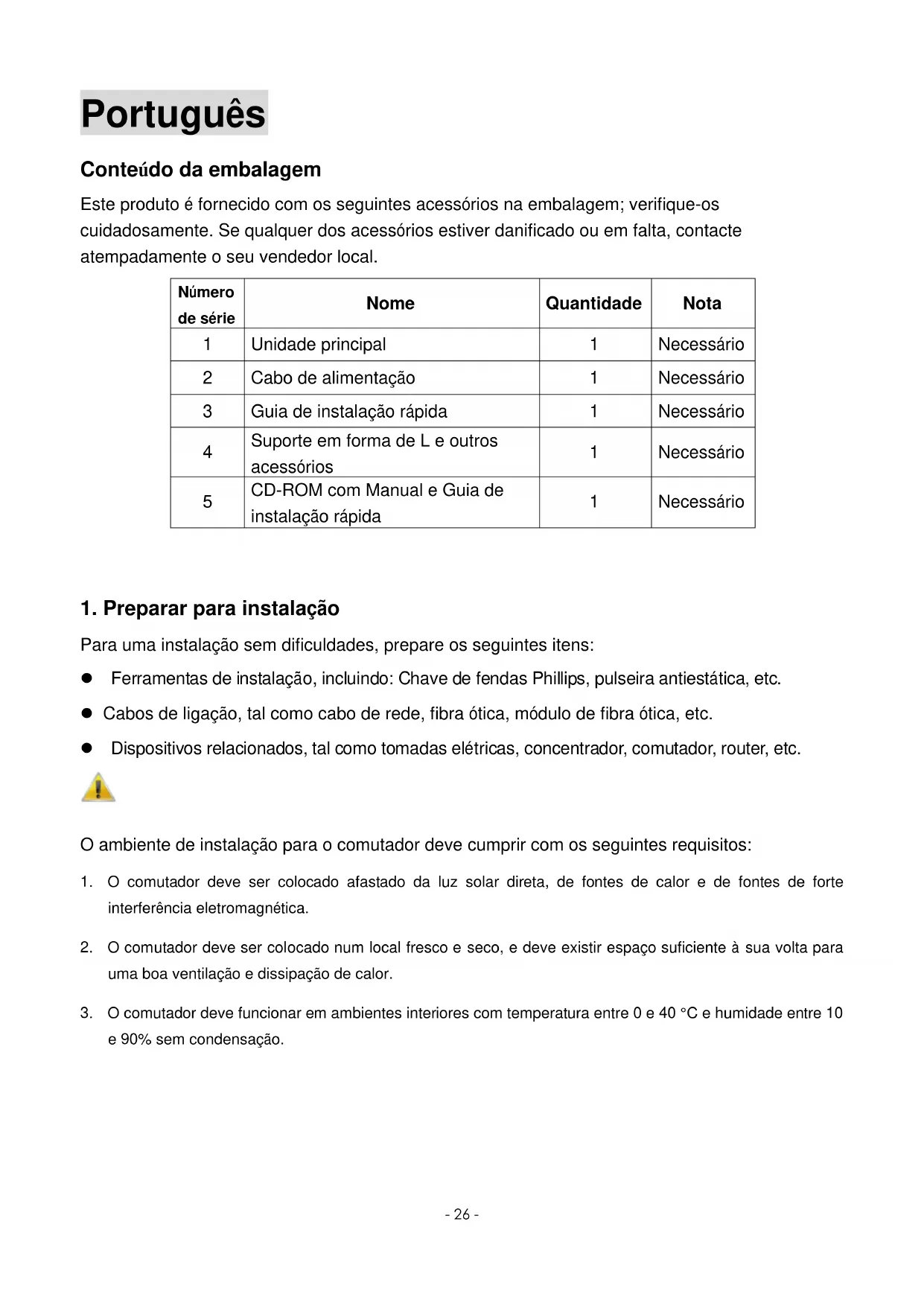 Para uma instalação sem dificuldades, prepare os seguintes itens: Ferramentas de instalação, incluindo: Chave de fendas Phillips, pulseira antiestática, etc. Cabos de ligação, tal como cabo de rede, fibra ótica, módulo de fibra ótica, etc. Dispositivos relacionados, tal como tomadas elétricas, concentrador, comutador, router, etc. O ambiente de instalação para o comutador deve cumprir com os seguintes requisitos: