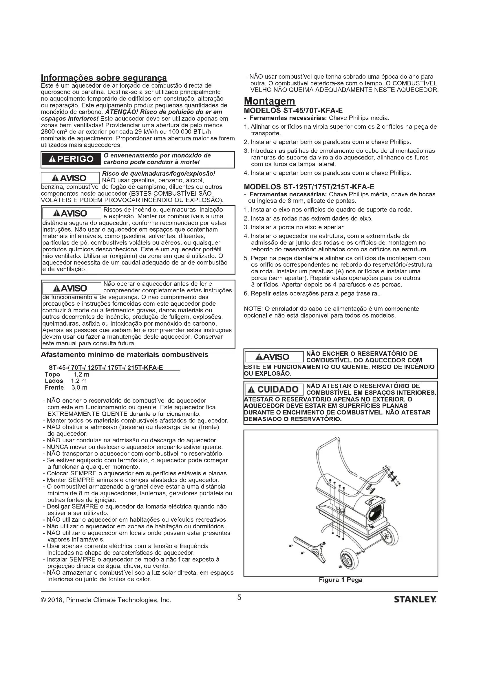- Ferramentas necessárias: Chave Phillips média, chave de bocas ou inglesa de 8 mm, alicate de pontas.1. Instalar o eixo nos orifícios do quadro de suporte da roda.2. Instalar as rodas nas extremidades do eixo.3. Instalar a porca no eixo e apertar.4. Instalar o aquecedor na estrutura, com a extremidade da admissão de ar junto das rodas e os orifícios de montagem no rebordo do reservatório alinhados com os orifícios na estrutura.5. Pegar na pega dianteira e alinhar os orifícios de montagem com os orifícios correspondentes no rebordo do reservatório/estrutura da roda. Instalar um parafuso (A) nos orifícios e instalar uma porca (sem apertar). Repetir estas operações para os outros 3 orifícios. Apertar depois os 4 parafusos e as porcas.6. Repetir estas operações para a pega traseira..NOTE: O enrolador do cabo de alimentação é um componente opcional e não está disponível para todos os modelos. AVISO O envenenamento por monóxido de carbono pode conduzir à morte! PERIGO NÃO ENCHER O RESERVATÓRIO DE COMBUSTÍVEL DO AQUECEDOR COM ESTE EM FUNCIONAMENTO OU QUENTE. RISCO DE INCÊNDIO OU EXPLOSÃO. AVISO NÃO ATESTAR O RESERVATÓRIO DE COMBUSTÍVEL EM ESPAÇOS INTERIORES. ATESTAR O RESERVATÓRIO APENAS NO EXTERIOR. O AQUECEDOR DEVE ESTAR EM SUPERFÍCIES PLANAS DURANTE O ENCHIMENTO DE COMBUSTÍVEL. NÃO ATESTAR DEMASIADO O RESERVATÓRIO. Figura 1 Pega Não operar o aquecedor antes de ler e compreender completamente estas instruções de funcionamento e de segurança. O não cumprimento das precauções e instruções fornecidas com este aquecedor pode conduzir à morte ou a ferimentos graves, danos materiais ou outros decorrentes de incêndio, produção de fuligem, explosões, queimaduras, asfixia ou intoxicação por monóxido de carbono. Apenas as pessoas que saibam ler e compreender estas instruções devem usar ou fazer a manutenção deste aquecedor. Conservar este manual para consulta futura. AVISO Riscos de incêndio, queimaduras, inalação e explosão. Manter os combustíveis a uma distância segura do aquecedor, conforme recomendado por estas instruções. Não usar o aquecedor em espaços que contenham materiais inflamáveis, como gasolina, solventes, diluentes, partículas de pó, combustíveis voláteis ou aéreos, ou quaisquer produtos químicos desconhecidos. Este é um aquecedor portátil não ventilado. Utiliza ar (oxigénio) da zona em que é utilizado. O aquecedor necessita de um caudal adequado de ar de combustão e de ventilação. AVISO© 2018, Pinnacle Climate Technologies, Inc.