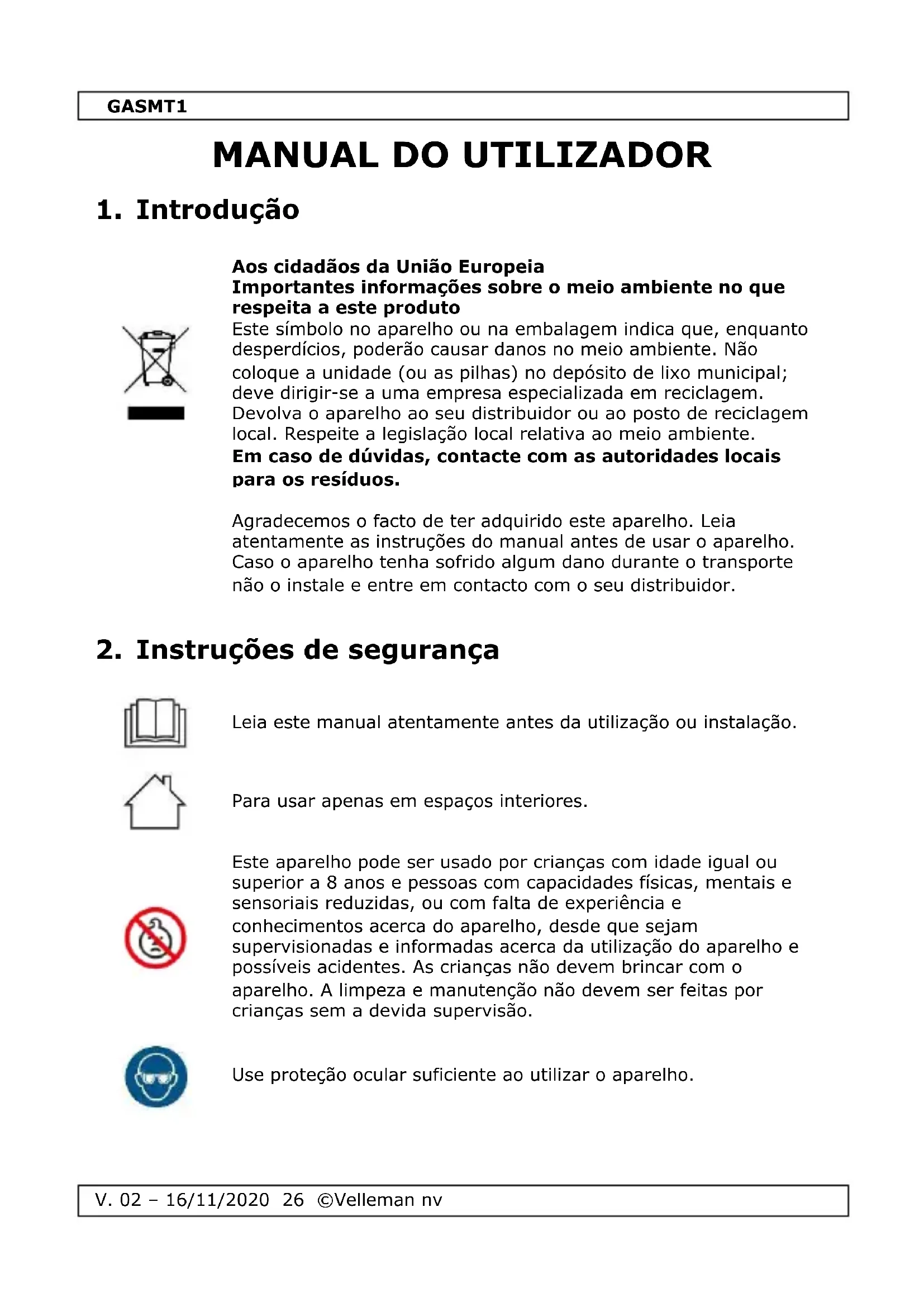 Encontre gratuitamente o manual do aparelho GASMT1 VELLEMAN em formato PDF.