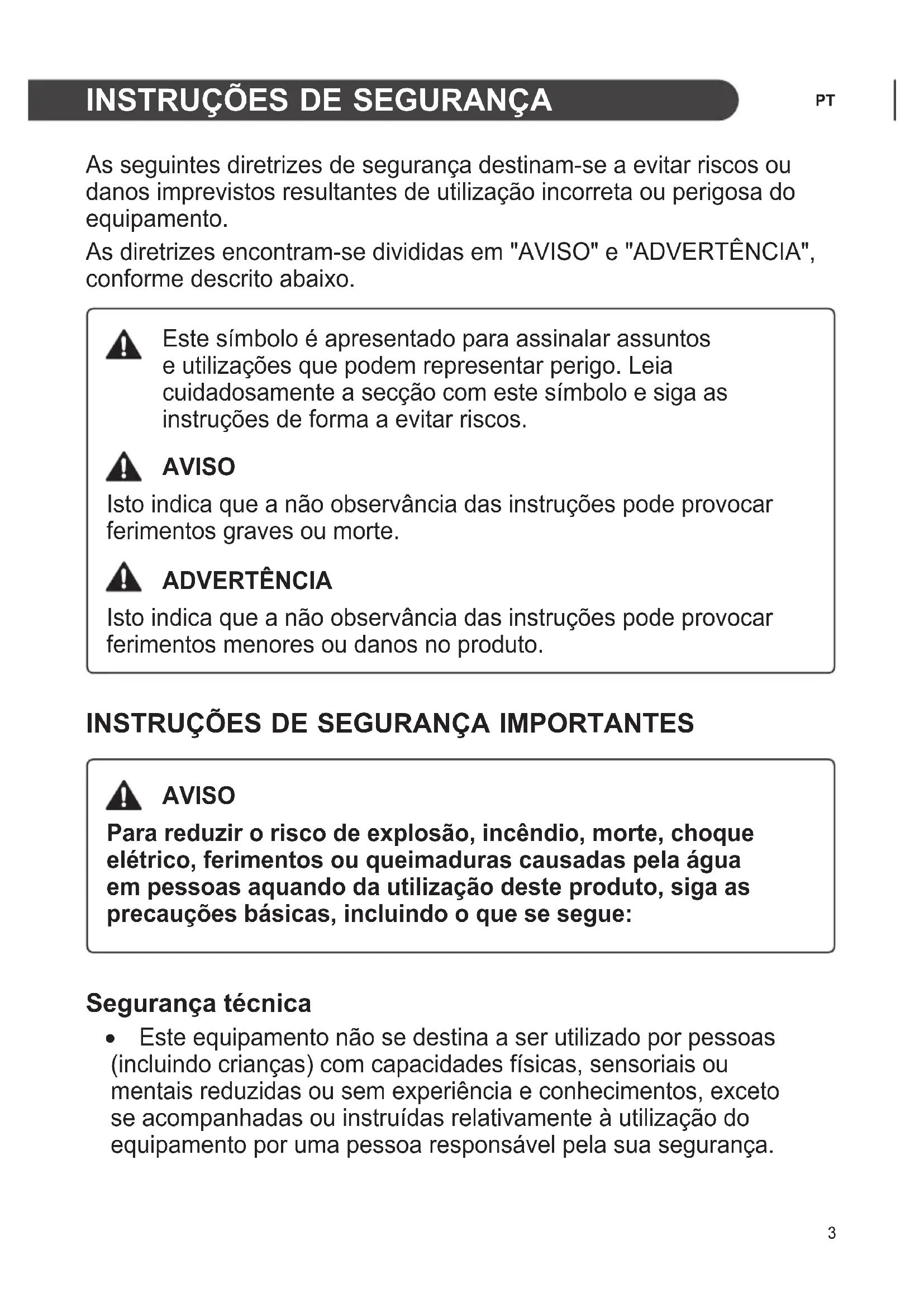 AVISO Para reduzir o risco de explosão, incêndio, morte, choque elétrico, ferimentos ou queimaduras causadas pela água em pessoas aquando da utilização deste produto, siga as precauções básicas, incluindo o que se segue: Segurança técnica