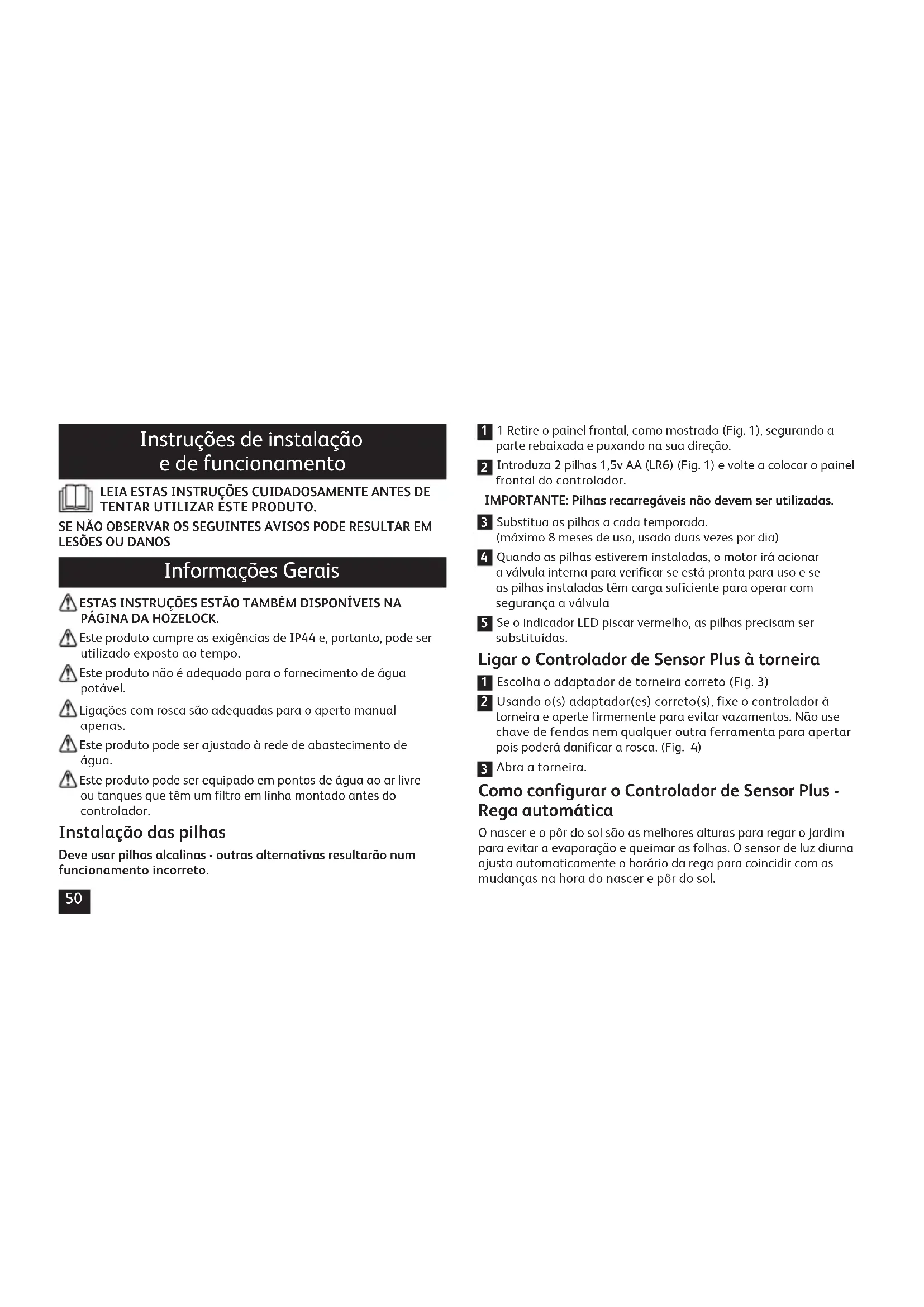 Informações Gerais ESTAS INSTRUÇÕES ESTÃO TAMBÉM DISPONÍVEIS NA PÁGINA DA HOZELOCK. Este produto cumpre as exigências de IP44 e, portanto, pode ser utilizado exposto ao tempo. Este produto não é adequado para o fornecimento de água potável. Ligações com rosca são adequadas para o aperto manual apenas. Este produto pode ser ajustado à rede de abastecimento de água. Este produto pode ser equipado em pontos de água ao ar livre ou tanques que têm um filtro em linha montado antes do controlador. Instalação das pilhas Deve usar pilhas alcalinas - outras alternativas resultarão num funcionamento incorreto.