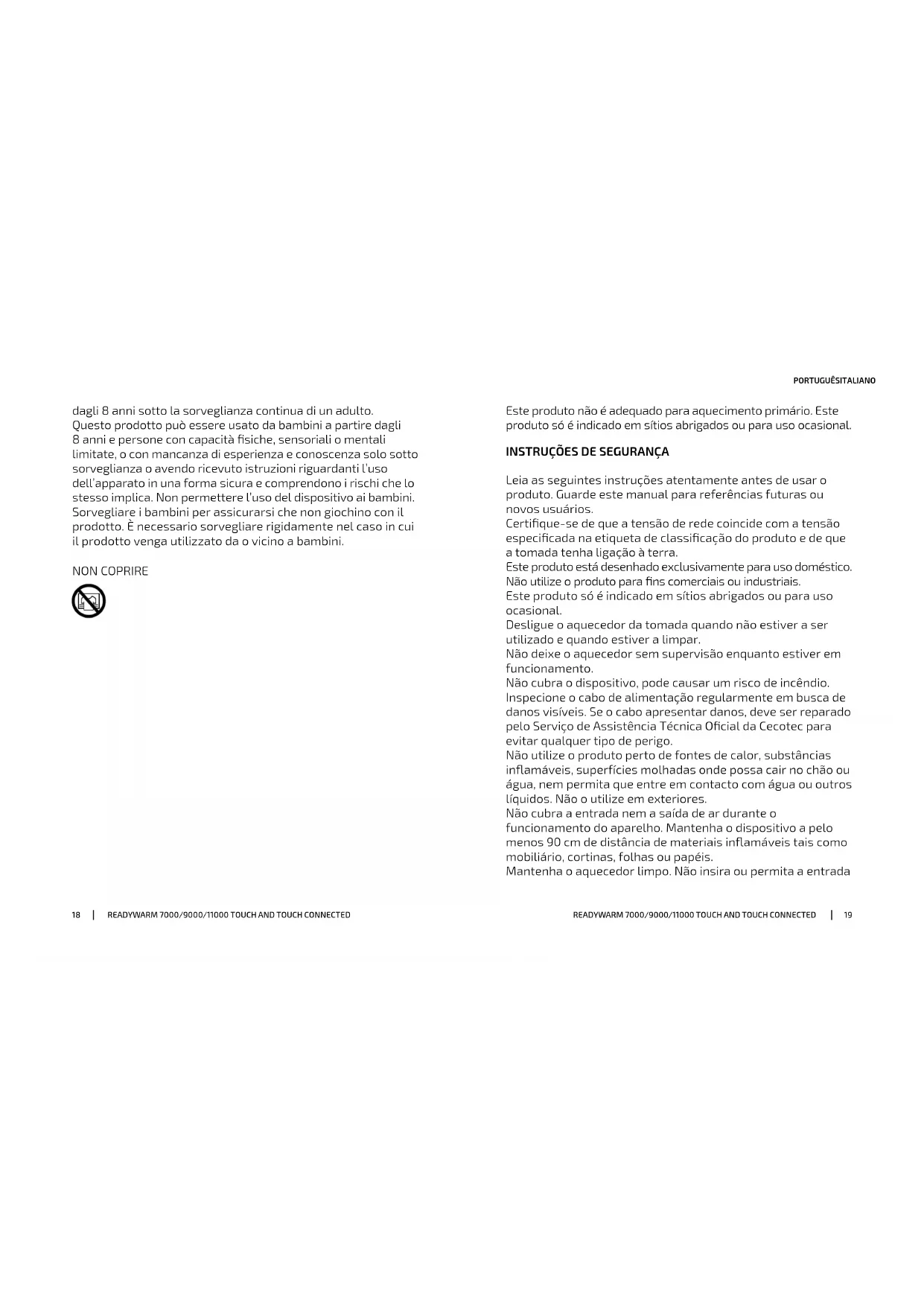 Leia as seguintes instruções atentamente antes de usar o produto. Guarde este manual para referências futuras ou novos usuários. Certique-se de que a tensão de rede coincide com a tensão especicada na etiqueta de classicação do produto e de que a tomada tenha ligação à terra. Este produto está desenhado exclusivamente para uso doméstico. Não utilize o produto para ns comerciais ou industriais. Este produto só é indicado em sítios abrigados ou para uso ocasional. Desligue o aquecedor da tomada quando não estiver a ser utilizado e quando estiver a limpar. Não deixe o aquecedor sem supervisão enquanto estiver em funcionamento. Não cubra o dispositivo, pode causar um risco de incêndio. Inspecione o cabo de alimentação regularmente em busca de danos visíveis. Se o cabo apresentar danos, deve ser reparado pelo Serviço de Assistência Técnica Ocial da Cecotec para evitar qualquer tipo de perigo. Não utilize o produto perto de fontes de calor, substâncias inamáveis, superfícies molhadas onde possa cair no chão ou água, nem permita que entre em contacto com água ou outros líquidos. Não o utilize em exteriores. Não cubra a entrada nem a saída de ar durante o funcionamento do aparelho. Mantenha o dispositivo a pelo menos 90 cm de distância de materiais inamáveis tais como mobiliário, cortinas, folhas ou papéis. Mantenha o aquecedor limpo. Não insira ou permita a entrada dagli 8 anni sotto la sorveglianza continua di un adulto. Questo prodotto può essere usato da bambini a partire dagli 8 anni e persone con capacità siche, sensoriali o mentali limitate, o con mancanza di esperienza e conoscenza solo sotto sorveglianza o avendo ricevuto istruzioni riguardanti l’uso dell’apparato in una forma sicura e comprendono i rischi che lo stesso implica. Non permettere l’uso del dispositivo ai bambini. Sorvegliare i bambini per assicurarsi che non giochino con il prodotto. È necessario sorvegliare rigidamente nel caso in cui il prodotto venga utilizzato da o vicino a bambini. NON COPRIREREADYWARM 7000/9000/11000 TOUCH AND TOUCH CONNECTEDREADYWARM 7000/9000/11000 TOUCH AND TOUCH CONNECTED 2120