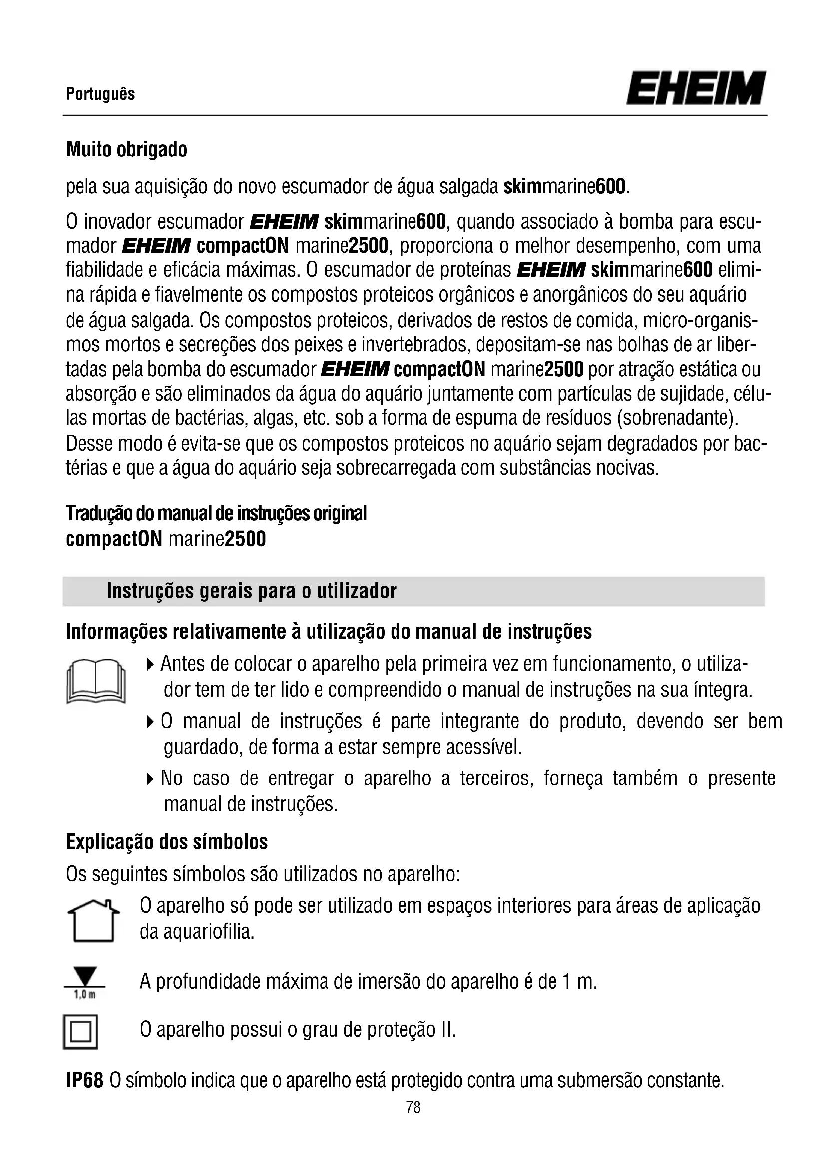 Entrada de aire 300 - 540 l/h ø cuerpo 16 cm Espacio ocupado mm 190 x 160 Nivel de agua mm 180 - 240 Dimensiones L x a x A cm 19 x 19 x 52,5 77Muito obrigado pela sua aquisição do novo escumador de água salgada skimmarine600. O inovador escumador EHEIM skimmarine600, quando associado à bomba para escu- mador EHEIM compactON marine2500, proporciona o melhor desempenho, com uma fiabilidade e eficácia máximas. O escumador de proteínas EHEIM skimmarine600 elimi- na rápida e fiavelmente os compostos proteicos orgânicos e anorgânicos do seu aquário de água salgada. Os compostos proteicos, derivados de restos de comida, micro-organis- mos mortos e secreções dos peixes e invertebrados, depositam-se nas bolhas de ar liber- tadas pela bomba do escumador EHEIM compactON marine2500 por atração estática ou absorção e são eliminados da água do aquário juntamente com partículas de sujidade, célu- las mortas de bactérias, algas, etc. sob a forma de espuma de resíduos (sobrenadante). Desse modo é evita-se que os compostos proteicos no aquário sejam degradados por bac- térias e que a água do aquário seja sobrecarregada com substâncias nocivas. Português Instruções gerais para o utilizador Informações relativamente à utilização do manual de instruções Antes de colocar o aparelho pela primeira vez em funcionamento, o utiliza- dor tem de ter lido e compreendido o manual de instruções na sua íntegra. O manual de instruções é parte integrante do produto, devendo ser bem guardado, de forma a estar sempre acessível. No caso de entregar o aparelho a terceiros, forneça também o presente manual de instruções. Explicação dos símbolos Os seguintes símbolos são utilizados no aparelho: O aparelho só pode ser utilizado em espaços interiores para áreas de aplicação da aquariofilia. A profundidade máxima de imersão do aparelho é de 1 m. O aparelho possui o grau de proteção II. IP68 O símbolo indica que o aparelho está protegido contra uma submersão constante. Tradução do manual de instruções original compactON marine2500 78O aparelho foi aprovado de acordo com as respetivas normas e diretivas nacionais, e corresponde às normas da UE Os seguintes símbolos e palavras de sinalização são utilizados neste manual de instruções.: PERIGO! O símbolo indica um perigo iminente causado por choque elétrico, que pode levar à morte ou a ferimentos graves. PERIGO! O símbolo indica um perigo iminente, que pode levar à morte ou a ferimentos graves. AVISO! O símbolo indica um perigo iminente, que pode causar ferimentos médios ou leves, ou representar um risco para a saúde. CUIDADO! O símbolo indica um perigo de danos materiais. Indicação com informações e dicas úteis. Informação sobre a apresentação: A Referência a uma figura, neste caso, à Figura A. É solicitado a tomar uma medida. Âmbito de aplicação O aparelho e todas as peças incluídas no volume de fornecimento destinam-se ao uso privado, podendo exclusivamente ser utilizados da seguinte forma: