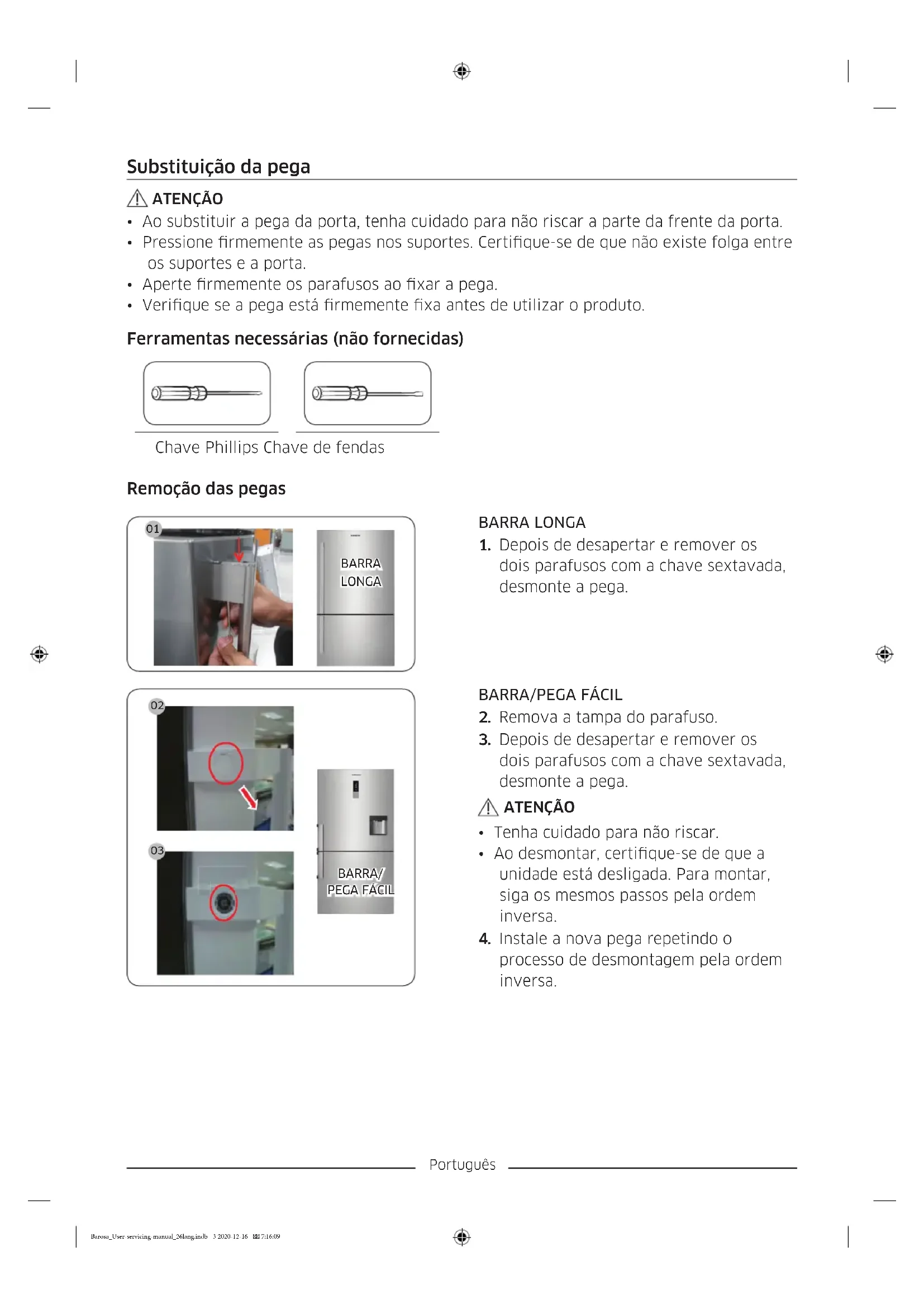 processo de desmontagem pela ordem inversa. Barosa_User-servicing-manual_26lang.indb 3 2020-12-16 7:16:09Português Substituição do vedante ATENÇÃO Fixe o vedante rmemente. Se não o zer, poderá haver uma fuga de ar frio do frigoríco. Remoção do vedante