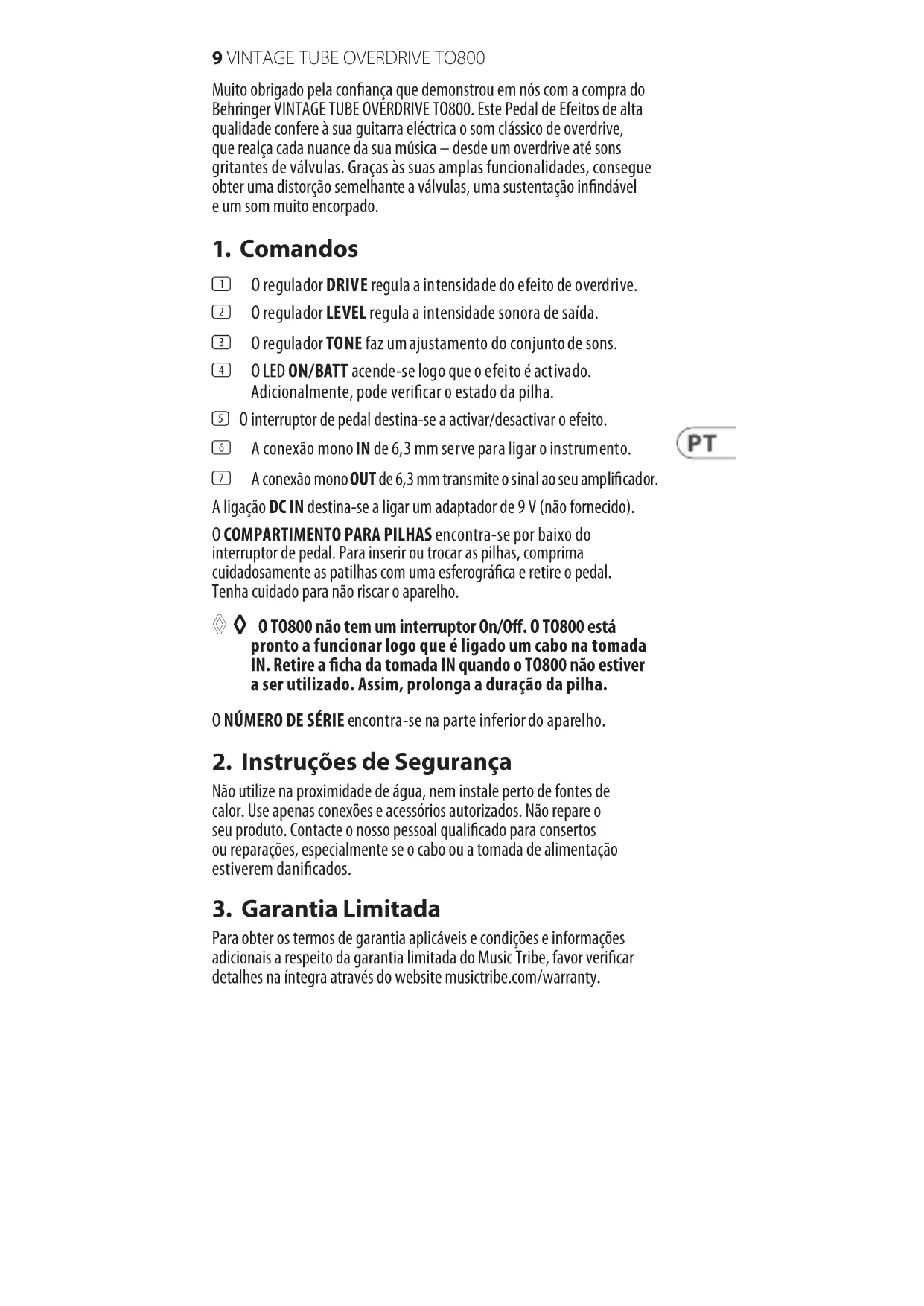 Para obter os termos de garantia aplicáveis e condições e informações adicionais a respeito da garantia limitada do Music Tribe, favor vericar detalhes na íntegra através do website musictribe.com/warranty.10 VINTAGE TUBE OVERDRIVE TO800