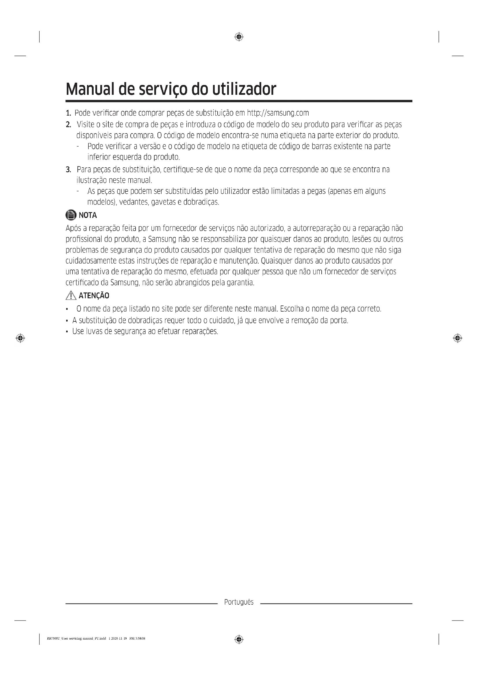 ilustração neste manual. - As peças que podem ser substituídas pelo utilizador estão limitadas a pegas (apenas em alguns modelos), vedantes, gavetas e dobradiças. NOTA Após a reparação feita por um fornecedor de serviços não autorizado, a autorreparação ou a reparação não prossional do produto, a Samsung não se responsabiliza por quaisquer danos ao produto, lesões ou outros problemas de segurança do produto causados por qualquer tentativa de reparação do mesmo que não siga cuidadosamente estas instruções de reparação e manutenção. Quaisquer danos ao produto causados por uma tentativa de reparação do mesmo, efetuada por qualquer pessoa que não um fornecedor de serviços certicado da Samsung, não serão abrangidos pela garantia. ATENÇÃO