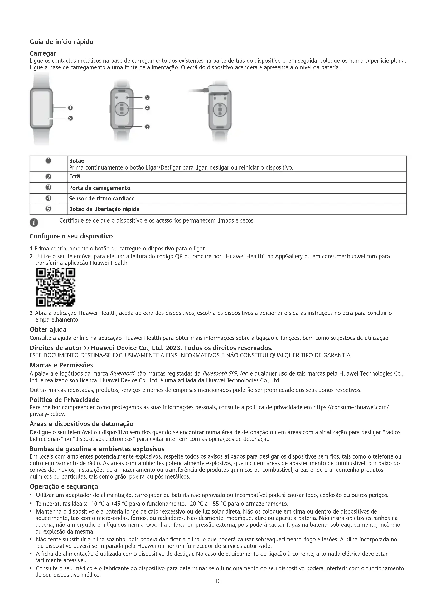 Botão de libertação rápida Certique-se de que o dispositivo e os acessórios permanecem limpos e secos. Congure o seu dispositivo 1 Prima continuamente o botão ou carregue o dispositivo para o ligar. 2 Utilize o seu telemóvel para efetuar a leitura do código QR ou procure por "Huawei Health" na AppGallery ou em consumer.huawei.com para transferir a aplicação Huawei Health. 3 Abra a aplicação Huawei Health, aceda ao ecrã dos dispositivos, escolha os dispositivos a adicionar e siga as instruções no ecrã para concluir o emparelhamento. Obter ajuda Consulte a ajuda online na aplicação Huawei Health para obter mais informações sobre a ligação e funções, bem como sugestões de utilização. Direitos de autor © Huawei Device Co., Ltd. 2023. Todos os direitos reservados. ESTE DOCUMENTO DESTINA-SE EXCLUSIVAMENTE A FINS INFORMATIVOS E NÃO CONSTITUI QUALQUER TIPO DE GARANTIA. Marcas e Permissões A palavra e logótipos da marca Bluetooth