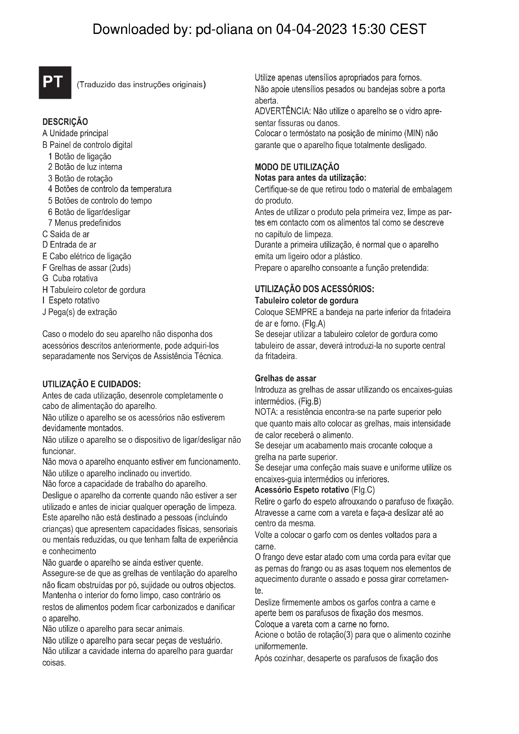 Notas para antes da utilização: Certique-se de que retirou todo o material de embalagem do produto. Antes de utilizar o produto pela primeira vez, limpe as par- tes em contacto com os alimentos tal como se descreve no capítulo de limpeza. Durante a primeira utilização, é normal que o aparelho emita um ligeiro odor a plástico. Prepare o aparelho consoante a função pretendida: UTILIZAÇÃO DOS ACESSÓRIOS: Tabuleiro coletor de gordura Coloque SEMPRE a bandeja na parte inferior da fritadeira de ar e forno. (FIg.A) Se desejar utilizar a tabuleiro coletor de gordura como tabuleiro de assar, deverá introduzi-la no suporte central da fritadeira. Grelhas de assar Introduza as grelhas de assar utilizando os encaixes-guias intermédios. (Fig.B) NOTA: a resistência encontra-se na parte superior pelo que quanto mais alto colocar as grelhas, mais intensidade de calor receberá o alimento. Se desejar um acabamento mais crocante coloque a grelha na parte superior. Se desejar uma confeção mais suave e uniforme utilize os encaixes-guia intermédios ou inferiores. Acessório Espeto rotativo (FIg.C) Retire o garfo do espeto afrouxando o parafuso de xação. Atravesse a carne com a vareta e faça-a deslizar até ao centro da mesma. Volte a colocar o garfo com os dentes voltados para a carne. O frango deve estar atado com uma corda para evitar que as pernas do frango ou as asas toquem nos elementos de aquecimento durante o assado e possa girar corretamen- te. Deslize rmemente ambos os garfos contra a carne e aperte bem os parafusos de xação dos mesmos. Coloque a vareta com a carne no forno. Acione o botão de rotação(3) para que o alimento cozinhe uniformemente. Após cozinhar, desaperte os parafusos de xação dos PT (Traduzido das instruções originais) Downloaded by: pd-oliana on 04-04-2023 15:30 CESTgarfos e remova a carne deslizando-a para a extremidade do espeto. Cuba rotativa A cuba rotativa pode ser utilizado para fritar batatas (450g congeladas, 400g ao natural ou assadas), legumes, carne, croquetes, nuggets, douraditos de peixe de peixe, entre outros produtos congelados. NOTA: para conseguir uma fritura uniforme, NÃO ENCHA demasiado a cuba. Verique se a cuba está bem fechada antes de iniciar o processo de fritura. Para colocar a cuba no aparelho, introduza primeiro a extremidade esquerda (Fig D) da cuba e, em seguida, en- caixe al extremidade direita no seu compartimento (Fig E). Acione o botão de Rotação (3) Utilização: Desenrole completamente o cabo antes de o ligar à tomada. Ligue o aparelho à corrente. Abra a porta. Se não for utilizar o tabuleiro colector de gordura (H) como tabuleiro de forno, introduza-o na parte inferior do aparelho. Utilize o acessório adequado de acordo com o tipo de alimentos que deseja cozinhar. Prepare os alimentos, coloque-os no acessório e introdu- za.os no aparelho. Feche a porta Prima o botão de ligar durante alguns segundos O ecrã ativa-se Em seguida, selecione a temperatura premindo os botões de controlo da temperatura (4). Selecione o tempo adequado premindo os botões de controlo de tempo (5) para a confeção, ou selecione um dos programas predenidos (7), se preferir. NOTA: tenha em conta que o tempo de confeção pode variar dependendo do tipo de alimento, quantidade e tamanho. Se utilizar o espeto rotativo ou a cuba rotativa, deverá acionar o botão de rotação (3). Se premir o botão de luz interna (2) poderá ir vericando o processo de confeção enquanto o aparelho está em funcionamento. Se abrir a porta, o aparelho para automaticamente e a luz acende-se Quando a voltar a fechar, o aparelho volta novamente a funcionar. Decorrido o tempo selecionado, ou terminado o menu predenido, o aparelho para automaticamente e emitirá um aviso sonoro. Para desligar completamente o aparelho, prima o botão de ligar/desligar até o ecrã se apagar. Abra a porta e retire os alimentos. ADVERTÊNCIA: Use sempre luvas para o forno, de modo a proteger as suas mãos. As peças metálicas podem aquecer durante a utilização. Para minimizar a produção de acrilamida durante o processo de confeção, não deixe que os alimentos quem tostados ou queimados. Deixe o aparelho e os utensílios arrefecer antes os limpar.