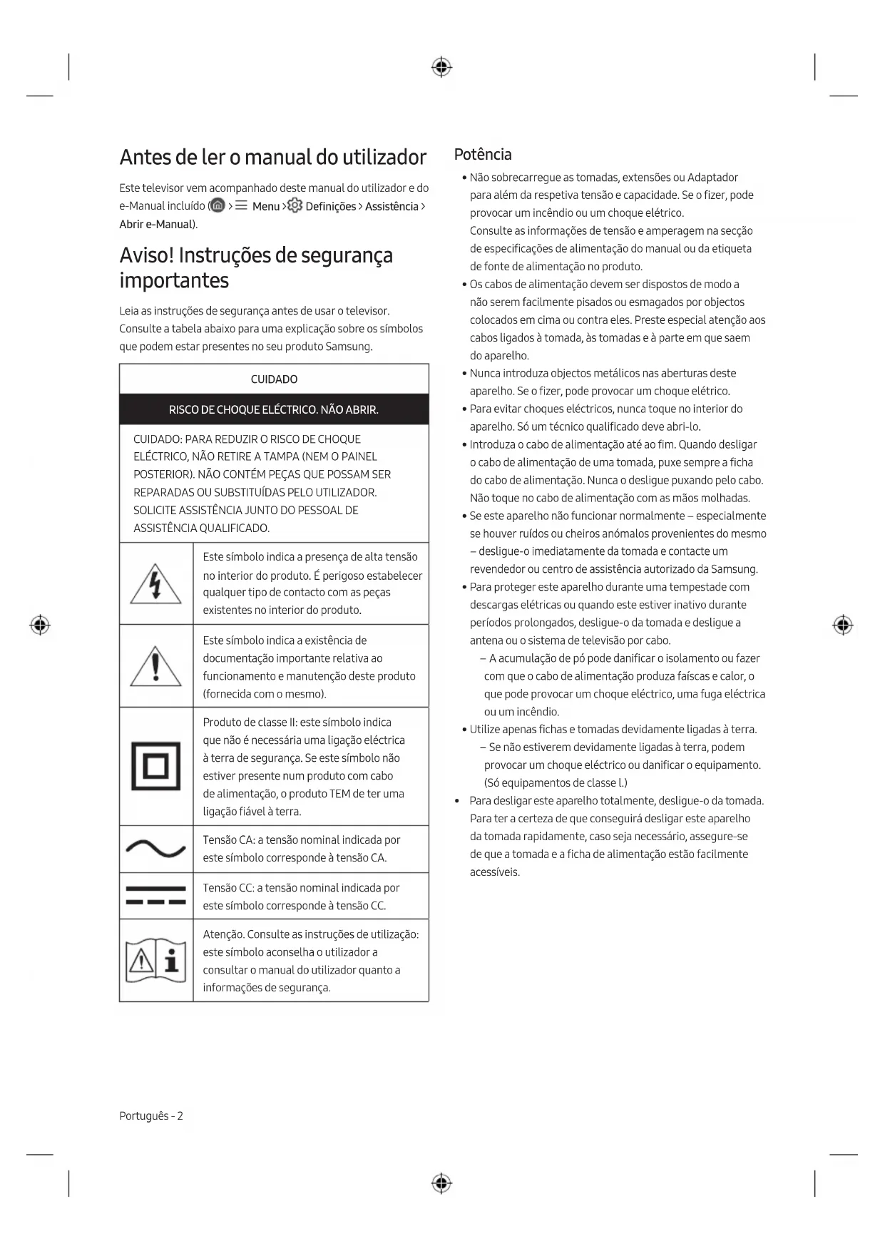 - El tipo de pila puede variar según el modelo. Español - 9 EspañolAntes de ler o manual do utilizador Este televisor vem acompanhado deste manual do utilizador e do e-Manual incluído ( > Menu > Definições > Assistência > Abrir e-Manual). Aviso! Instruções de segurança importantes Leia as instruções de segurança antes de usar o televisor. Consulte a tabela abaixo para uma explicação sobre os símbolos que podem estar presentes no seu produto Samsung. CUIDADO RISCO DE CHOQUE ELÉCTRICO. NÃO ABRIR. CUIDADO: PARA REDUZIR O RISCO DE CHOQUE ELÉCTRICO, NÃO RETIRE A TAMPA (NEM O PAINEL POSTERIOR). NÃO CONTÉM PEÇAS QUE POSSAM SER REPARADAS OU SUBSTITUÍDAS PELO UTILIZADOR. SOLICITE ASSISTÊNCIA JUNTO DO PESSOAL DE ASSISTÊNCIA QUALIFICADO. Este símbolo indica a presença de alta tensão no interior do produto. É perigoso estabelecer qualquer tipo de contacto com as peças existentes no interior do produto. Este símbolo indica a existência de documentação importante relativa ao funcionamento e manutenção deste produto (fornecida com o mesmo). Produto de classe II: este símbolo indica que não é necessária uma ligação eléctrica à terra de segurança. Se este símbolo não estiver presente num produto com cabo de alimentação, o produto TEM de ter uma ligação fiável à terra. Tensão CA: a tensão nominal indicada por este símbolo corresponde à tensão CA. Tensão CC: a tensão nominal indicada por este símbolo corresponde à tensão CC. Atenção. Consulte as instruções de utilização: este símbolo aconselha o utilizador a consultar o manual do utilizador quanto a informações de segurança. Potência
