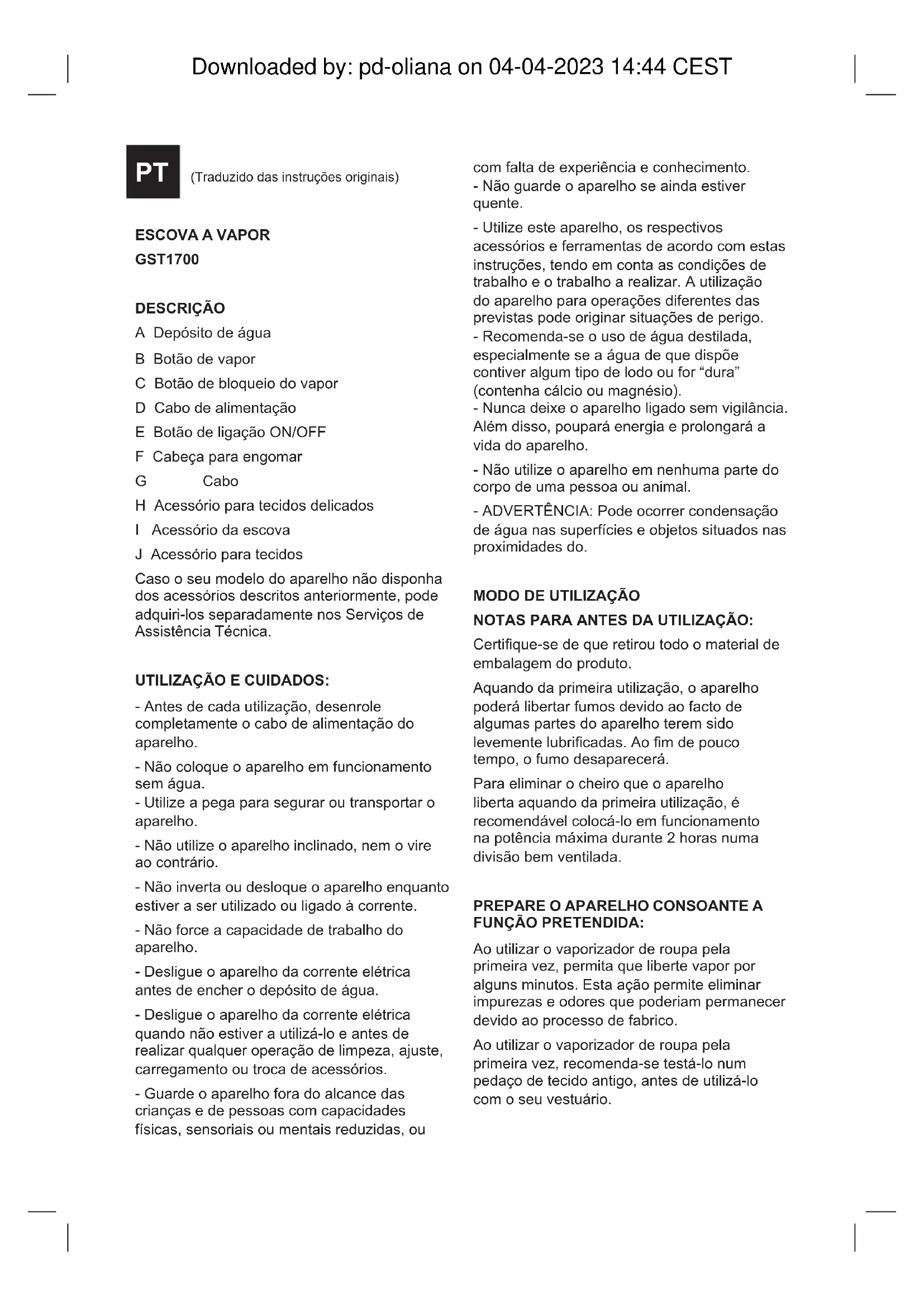 Attendre que le voyant rouge s’éteigne puis appuyez sur la touche « vapeur » jusqu'à ce que toute la quantité de solution contenue dans le réservoir soit vaporisée. Relâcher le bouton de vapeur, débrancher la prise et laisser l’appareil refroidir pendant 30 minutes. - Répéter la procédure ci-dessus autant de fois que nécessaire jusqu'à obtenir une vitesse de vapeur normale, généralement 2 à 3 fois. À chaque cycle répété, utiliser une solution d'eau douce. - Exécuter un cycle d'eau distillée dans l'unité une fois le détartrage terminé, avant d'utiliser à nouveau l’appareil. NETTOYAGE Débrancher l’appareil du secteur et attendre son refroidissement complet avant de le nettoyer. Nettoyer l’appareil électrique et son connecteur avec un chiffon humide et bien les sécher ensuite. NE JAMAIS IMMERGER L’APPAREIL NI LE CONNECTEUR DANS L’EAU NI AUCUN AUTRE LIQUIDE. Nettoyer l'appareil avec un chiffon humide imprégné de quelques gouttes de détergent et le laisser sécher. Ne pas utiliser de solvants ni de produits au pH acide ou basique tels qu’eau de Javel, ni de produits abrasifs pour nettoyer l’appareil. Ne pas immerger l'appareil dans l'eau ou dans tout autre liquide, ni le passer sous un robinet. Downloaded by: pd-oliana on 04-04-2023 14:44 CESTESCOVA A VAPOR GST1700 DESCRIÇÃO A Depósito de água B Botão de vapor C Botão de bloqueio do vapor D Cabo de alimentação E Botão de ligação ON/OFF F Cabeça para engomar G Cabo H Acessório para tecidos delicados I Acessório da escova J Acessório para tecidos Caso o seu modelo do aparelho não disponha dos acessórios descritos anteriormente, pode adquiri-los separadamente nos Serviços de Assistência Técnica. UTILIZAÇÃO E CUIDADOS: - Antes de cada utilização, desenrole completamente o cabo de alimentação do aparelho. - Não coloque o aparelho em funcionamento sem água. - Utilize a pega para segurar ou transportar o aparelho. - Não utilize o aparelho inclinado, nem o vire ao contrário. - Não inverta ou desloque o aparelho enquanto estiver a ser utilizado ou ligado à corrente. - Não force a capacidade de trabalho do aparelho. - Desligue o aparelho da corrente elétrica antes de encher o depósito de água. - Desligue o aparelho da corrente elétrica quando não estiver a utilizá-lo e antes de realizar qualquer operação de limpeza, ajuste, carregamento ou troca de acessórios. - Guarde o aparelho fora do alcance das crianças e de pessoas com capacidades físicas, sensoriais ou mentais reduzidas, ou com falta de experiência e conhecimento. - Não guarde o aparelho se ainda estiver quente. - Utilize este aparelho, os respectivos acessórios e ferramentas de acordo com estas instruções, tendo em conta as condições de trabalho e o trabalho a realizar. A utilização do aparelho para operações diferentes das previstas pode originar situações de perigo. - Recomenda-se o uso de água destilada, especialmente se a água de que dispõe contiver algum tipo de lodo ou for “dura” (contenha cálcio ou magnésio). - Nunca deixe o aparelho ligado sem vigilância. Além disso, poupará energia e prolongará a vida do aparelho. - Não utilize o aparelho em nenhuma parte do corpo de uma pessoa ou animal. - ADVERTÊNCIA: Pode ocorrer condensação de água nas superfícies e objetos situados nas proximidades do.