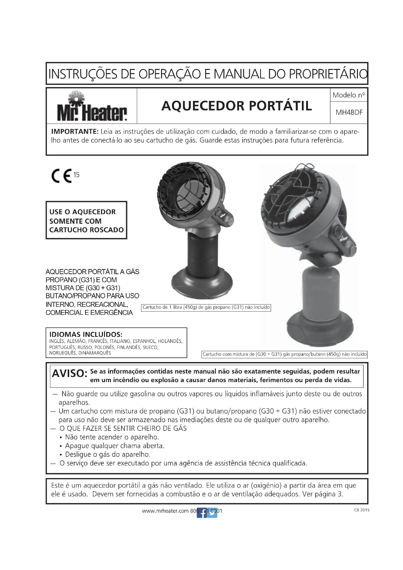 IMPORTANTE: Leia as instruções de utilização com cuidado, de modo a familiarizar-se com o apare- lho antes de conectá-lo ao seu cartucho de gás. Guarde estas instruções para futura referência. MH4BDF INSTRUÇ›ES DE OPERAÇ‹O E MANUAL DO PROPRIET˘RIO www.mrheater.com 800-251-0001 Modelo nÀ Cartucho com mistura de (G30 + G31) gás propano/butano (450g) não incluídoCartucho de 1 libra (450g) de gás propano (G31) não incluído