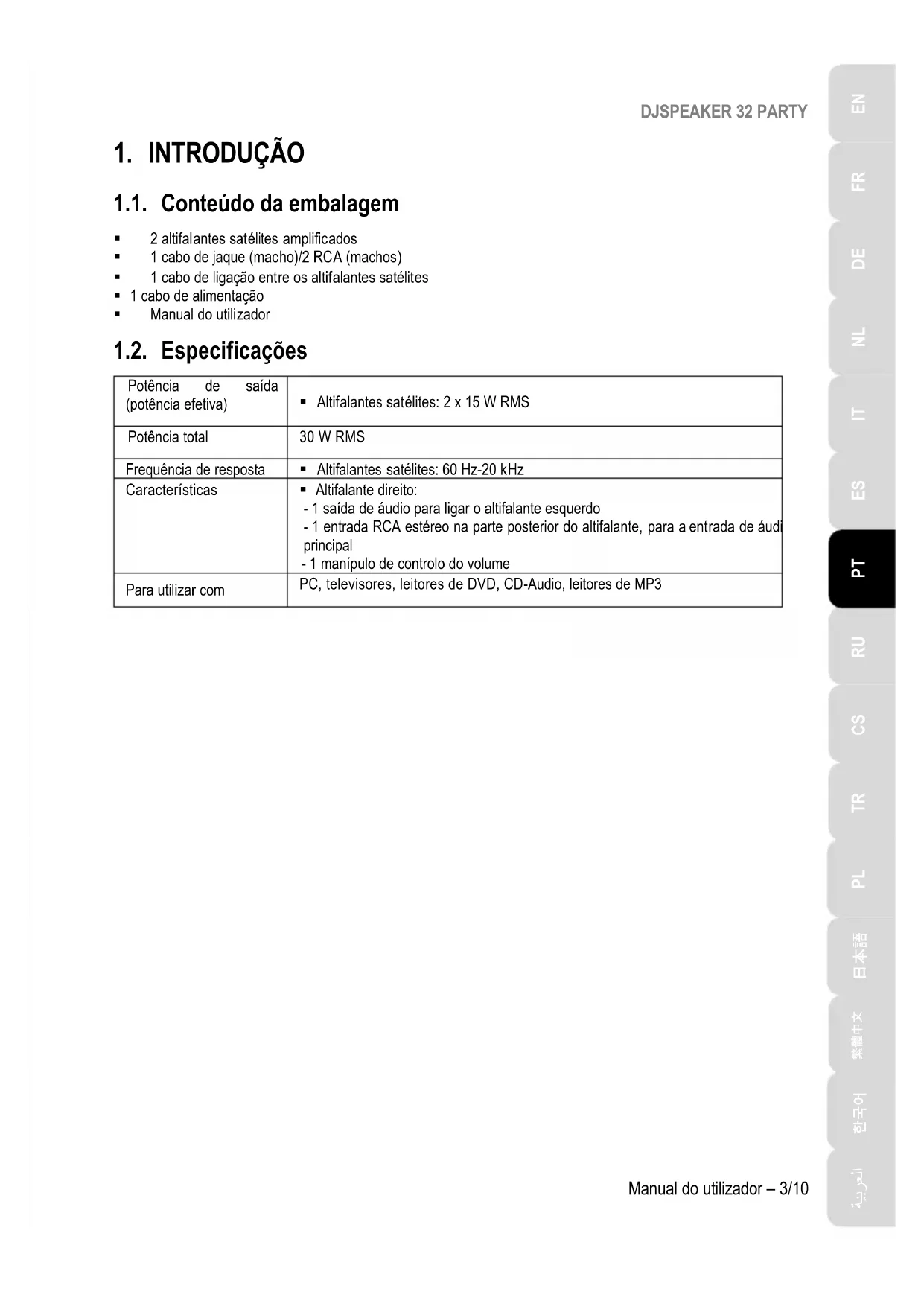 1.1. Conteúdo da embalagem 2 altifalantes satélites amplificados 1 cabo de jaque (macho)/2 RCA (machos) 1 cabo de ligação entre os altifalantes satélites 1 cabo de alimentação Manual do utilizador 1.2. Especificações Potência de saída (potência efetiva) Altifalantes satélites: 2 x 15 W RMS Potência total 30 W RMS Frequência de resposta Altifalantes satélites: 60 Hz-20 kHz Características Altifalante direito: - 1 saída de áudio para ligar o altifalante esquerdo