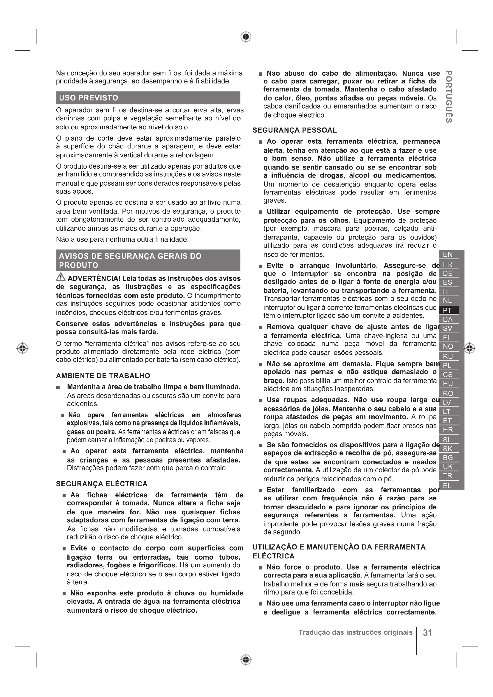 Aviso Antes de utilizar este produto, leia e compreenda todas as instruções neste Manual. Siga todos os avisos e todas as instruções de segurança. Utilize protecção ocular e auditiva. Tenha cuidado com os objectos voláteis ou lançados. Mantenha todos os transeuntes, em especial as crianças e os animais de estimação, a uma distância mínima de 15 m da área de utilização. Não utilize lâmina(s) de metal no produto. Não o exponha à chuva ou a condições de humidade.PORTUGUÊS