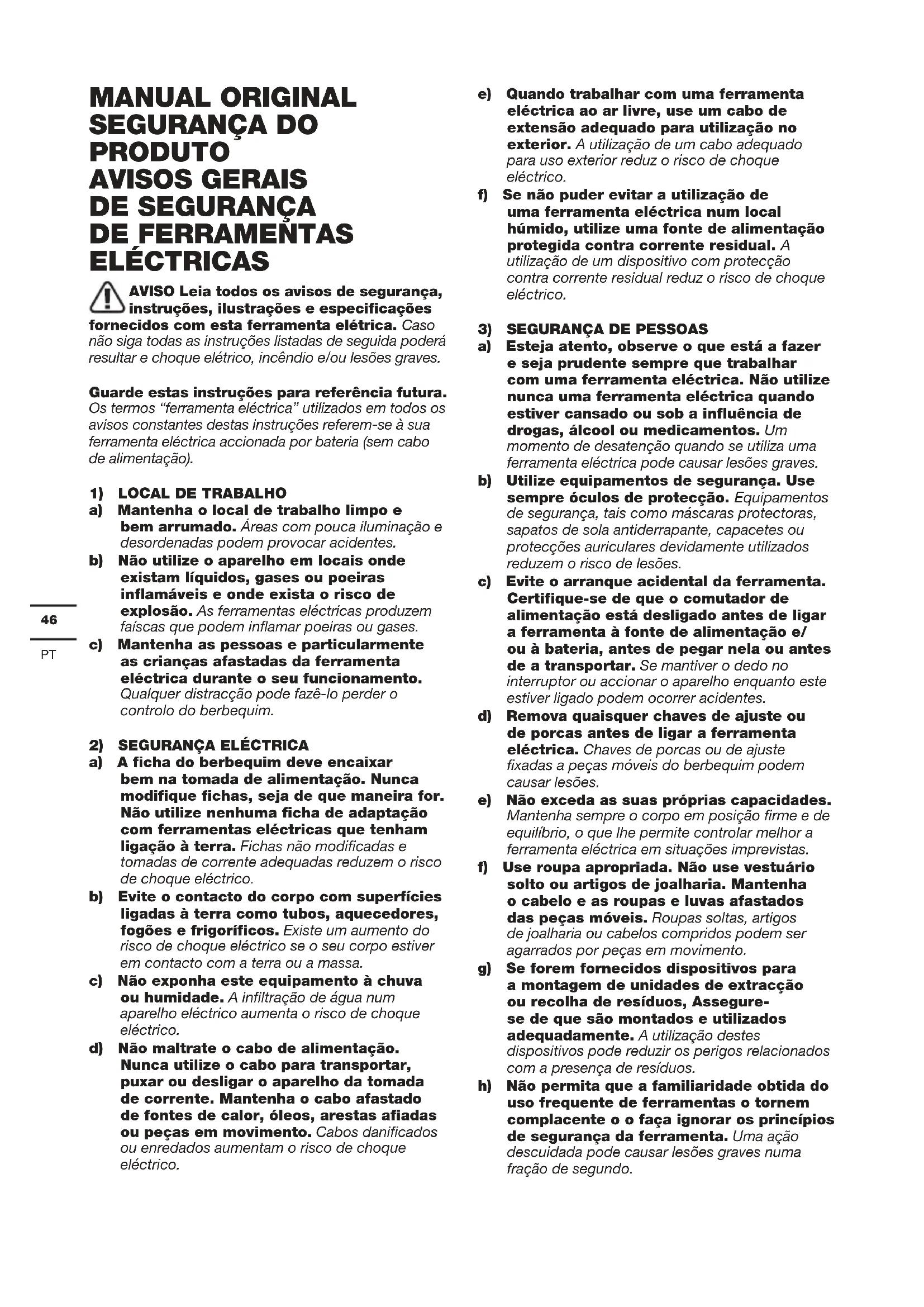 a) Esteja atento, observe o que está a fazer e seja prudente sempre que trabalhar com uma ferramenta eléctrica. Não utilize nunca uma ferramenta eléctrica quando estiver cansado ou sob a influência de drogas, álcool ou medicamentos. Um momento de desatenção quando se utiliza uma ferramenta eléctrica pode causar lesões graves. b) Utilize equipamentos de segurança. Use sempre óculos de protecção. Equipamentos de segurança, tais como máscaras protectoras, sapatos de sola antiderrapante, capacetes ou protecções auriculares devidamente utilizados reduzem o risco de lesões. c) Evite o arranque acidental da ferramenta. Certifique-se de que o comutador de alimentação está desligado antes de ligar a ferramenta à fonte de alimentação e/ ou à bateria, antes de pegar nela ou antes de a transportar. Se mantiver o dedo no interruptor ou accionar o aparelho enquanto este estiver ligado podem ocorrer acidentes. d) Remova quaisquer chaves de ajuste ou de porcas antes de ligar a ferramenta eléctrica. Chaves de porcas ou de ajuste fixadas a peças móveis do berbequim podem causar lesões. e) Não exceda as suas próprias capacidades. Mantenha sempre o corpo em posição firme e de equilíbrio, o que lhe permite controlar melhor a ferramenta eléctrica em situações imprevistas. f) Use roupa apropriada. Não use vestuário solto ou artigos de joalharia. Mantenha o cabelo e as roupas e luvas afastados das peças móveis. Roupas soltas, artigos de joalharia ou cabelos compridos podem ser agarrados por peças em movimento. g) Se forem fornecidos dispositivos para a montagem de unidades de extracção ou recolha de resíduos, Assegure- se de que são montados e utilizados adequadamente. A utilização destes dispositivos pode reduzir os perigos relacionados com a presença de resíduos. h) Não permita que a familiaridade obtida do uso frequente de ferramentas o tornem complacente o o faça ignorar os princípios de segurança da ferramenta. Uma ação descuidada pode causar lesões graves numa fração de segundo.47