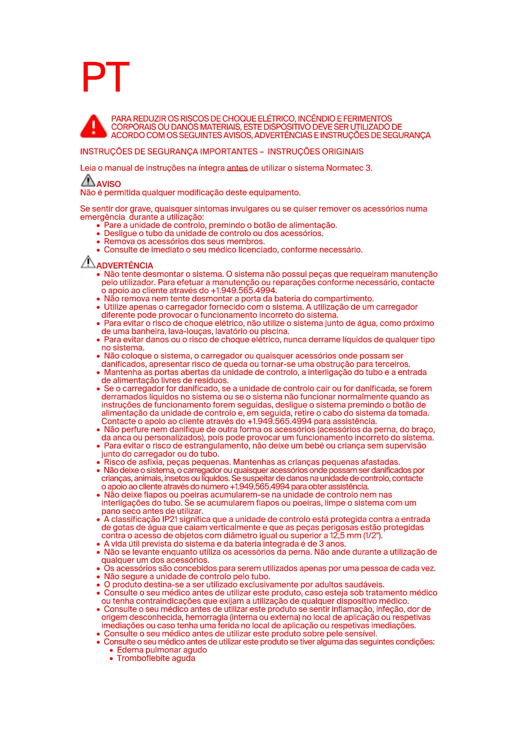 O MedWatch é o programa da Food and Drug Administration (FDA) para a notificação de reações graves, problemas de qualidade do produto, não-equivalência/falha terapêutica e erros de utilização de produtos médicos de uso humano, incluindo fármacos, produtos biológicos, dispositivos médicos, suplementos dietéticos, fórmulas para lactentes e cosméticos. Se o utilizador acreditar que o próprio, ou alguém da sua família, tenha sofrido uma reação grave a um produto médico, aconselha-se que leve o formulário de notificação ao seu médico. O seu prestador de cuidados de saúde pode fornecer informações clínicas com base no seu registo médico, que podem ajudar a FDA a avaliar a sua notificação. No entanto, entendemos que, por vários motivos, poderá não querer que o seu prestador de cuidados de saúde preencha o formulário, ou o prestador de cuidados de saúde poderá optar por não o preencher. O seu prestador de cuidados de saúde NÃO tem a obrigação de notificar a FDA. Nestas situações, poderá preencher o formulário de notificação online. A FDA enviar-lhe-á a confirmação da receção da sua notificação. As notificações são revistas pela equipa da FDA. Apenas será contactado pessoalmente se forem necessárias informações adicionais.PENTRU A REDUCE RISCUL DE ELECTROCUTARE, INCENDIU ȘI VĂTĂMĂRI CORPORALE SAU DAUNE MATERIALE, ACEST DISPOZITIV TREBUIE UTILIZAT CONFORM URMĂTOARELOR AVERTISMENTE, PRECAUȚII ȘI INSTRUCȚIUNI DE SIGURANȚĂ INSTRUCȚIUNI DE SIGURANȚĂ IMPORTANTE - INSTRUCȚIUNI ORIGINALE Înainte de a utiliza sistemul Normatec 3, citiți manualul de instrucțiuni în întregime. AVERTISMENT Modificarea acestui echipament este interzisă. În cazul în care simțiți o durere severă, manifestați simptome neobișnuite sau doriți să demontați accesoriile într-o situație de urgență în timpul utilizării: