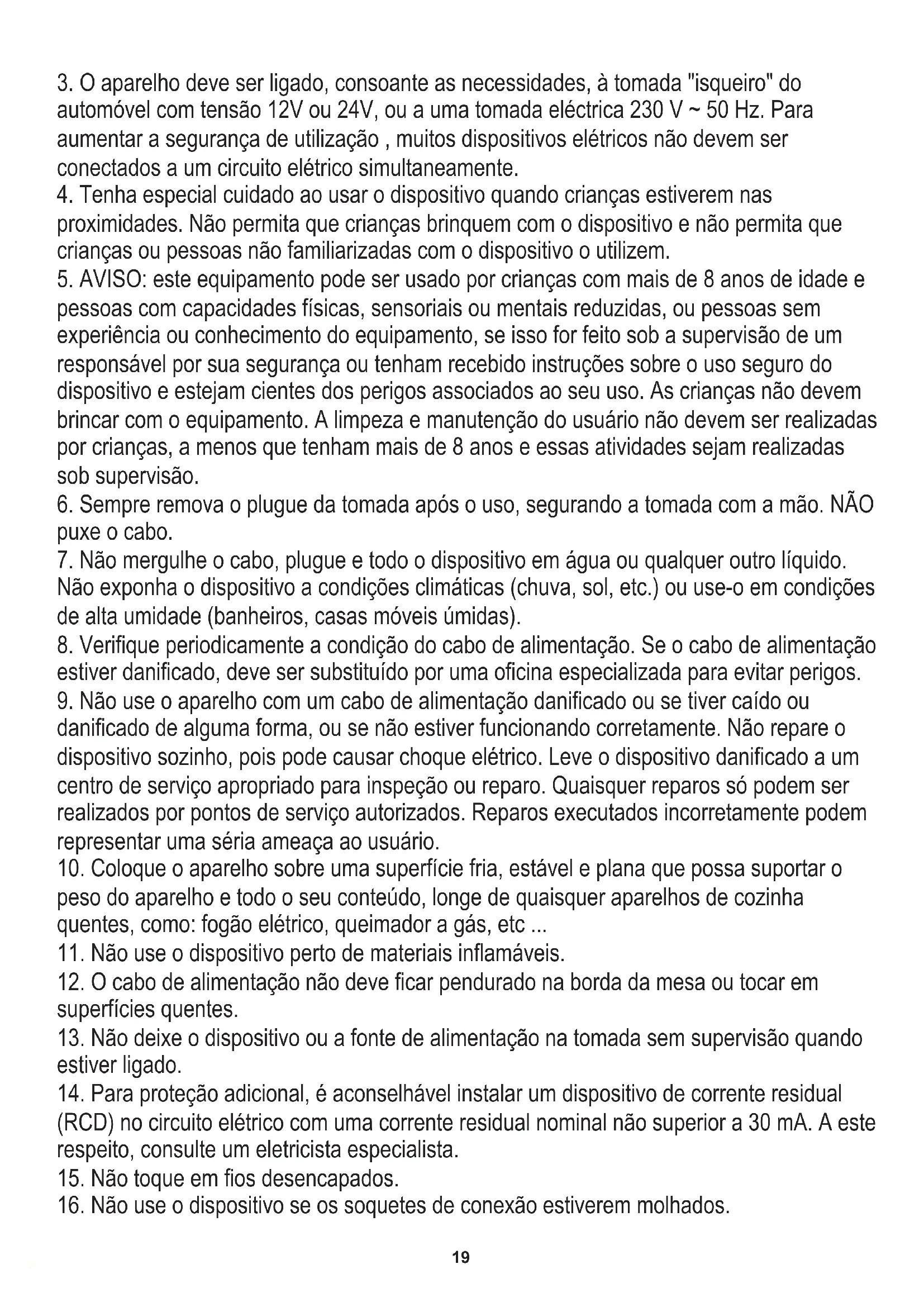 automóvel com tensão 12V ou 24V, ou a uma tomada eléctrica 230 V ~ 50 Hz. Para aumentar a segurança de utilização , muitos dispositivos elétricos não devem ser conectados a um circuito elétrico simultaneamente.