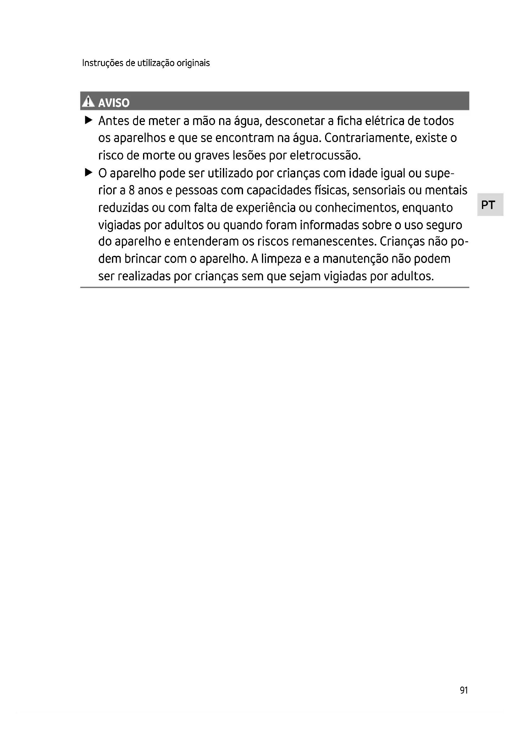 AVISO AVISO Antes de meter a mão na água, desconetar a ficha elétrica de todos os aparelhos e que se encontram na água. Contrariamente, existe o risco de morte ou graves lesões por eletrocussão. O aparelho pode ser utilizado por crianças com idade igual ou supe- rior a 8 anos e pessoas com capacidades físicas, sensoriais ou mentais reduzidas ou com falta de experiência ou conhecimentos, enquanto vigiadas por adultos ou quando foram informadas sobre o uso seguro do aparelho e entenderam os riscos remanescentes. Crianças não po- dem brincar com o aparelho. A limpeza e a manutenção não podem ser realizadas por crianças sem que sejam vigiadas por adultos.92 Instruções de segurança Conexão eléctrica