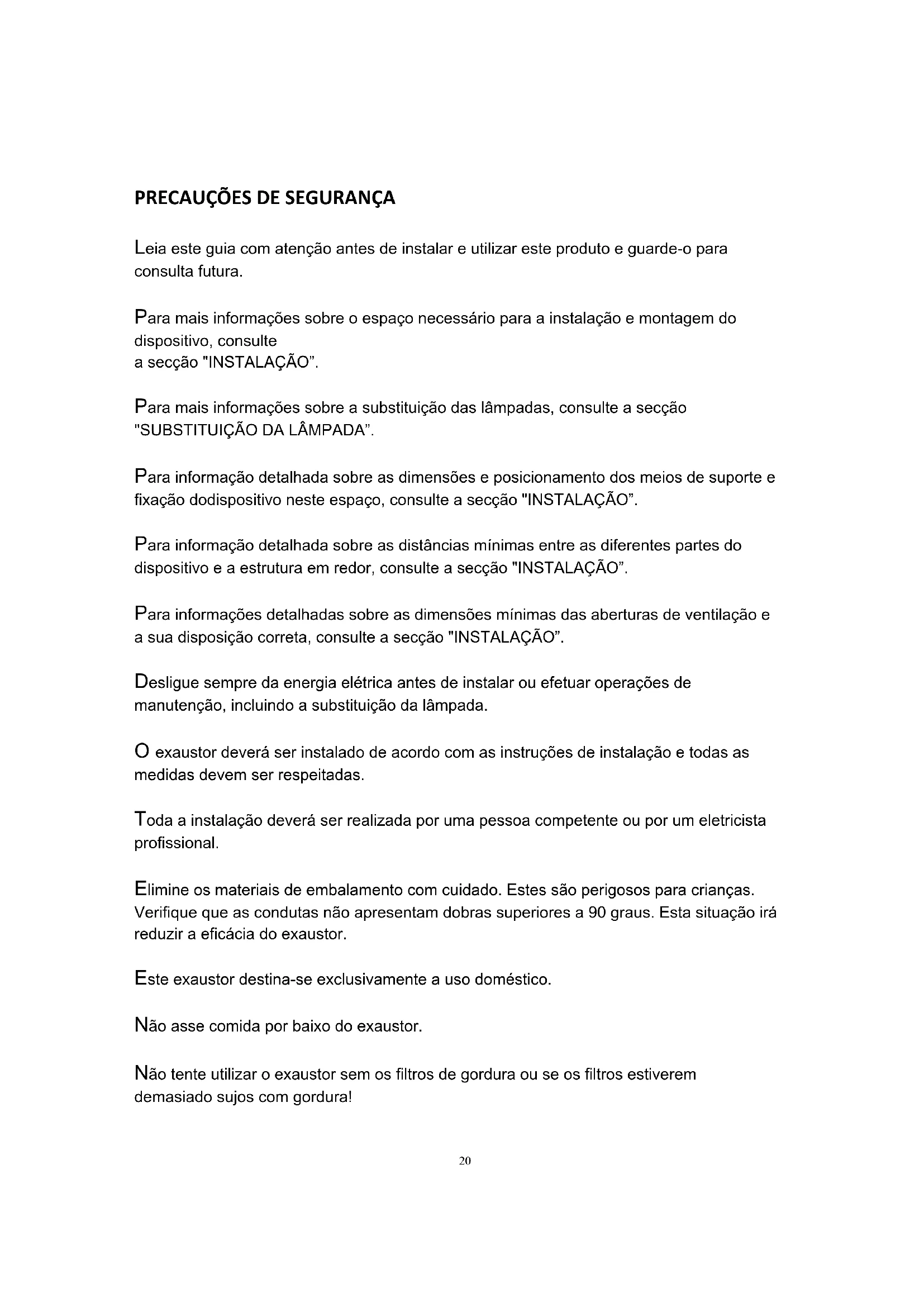 Leia este guia com atenção antes de instalar e utilizar este produto e guarde-o para consulta futura. Para mais informações sobre o espaço necessário para a instalação e montagem do dispositivo, consulte a secção "INSTALAÇÃO”. Para mais informações sobre a substituição das lâmpadas, consulte a secção "SUBSTITUIÇÃO DA LÂMPADA”. Para informação detalhada sobre as dimensões e posicionamento dos meios de suporte e fixação dodispositivo neste espaço, consulte a secção "INSTALAÇÃO”. Para informação detalhada sobre as distâncias mínimas entre as diferentes partes do dispositivo e a estrutura em redor, consulte a secção "INSTALAÇÃO”. Para informações detalhadas sobre as dimensões mínimas das aberturas de ventilação e a sua disposição correta, consulte a secção "INSTALAÇÃO”.