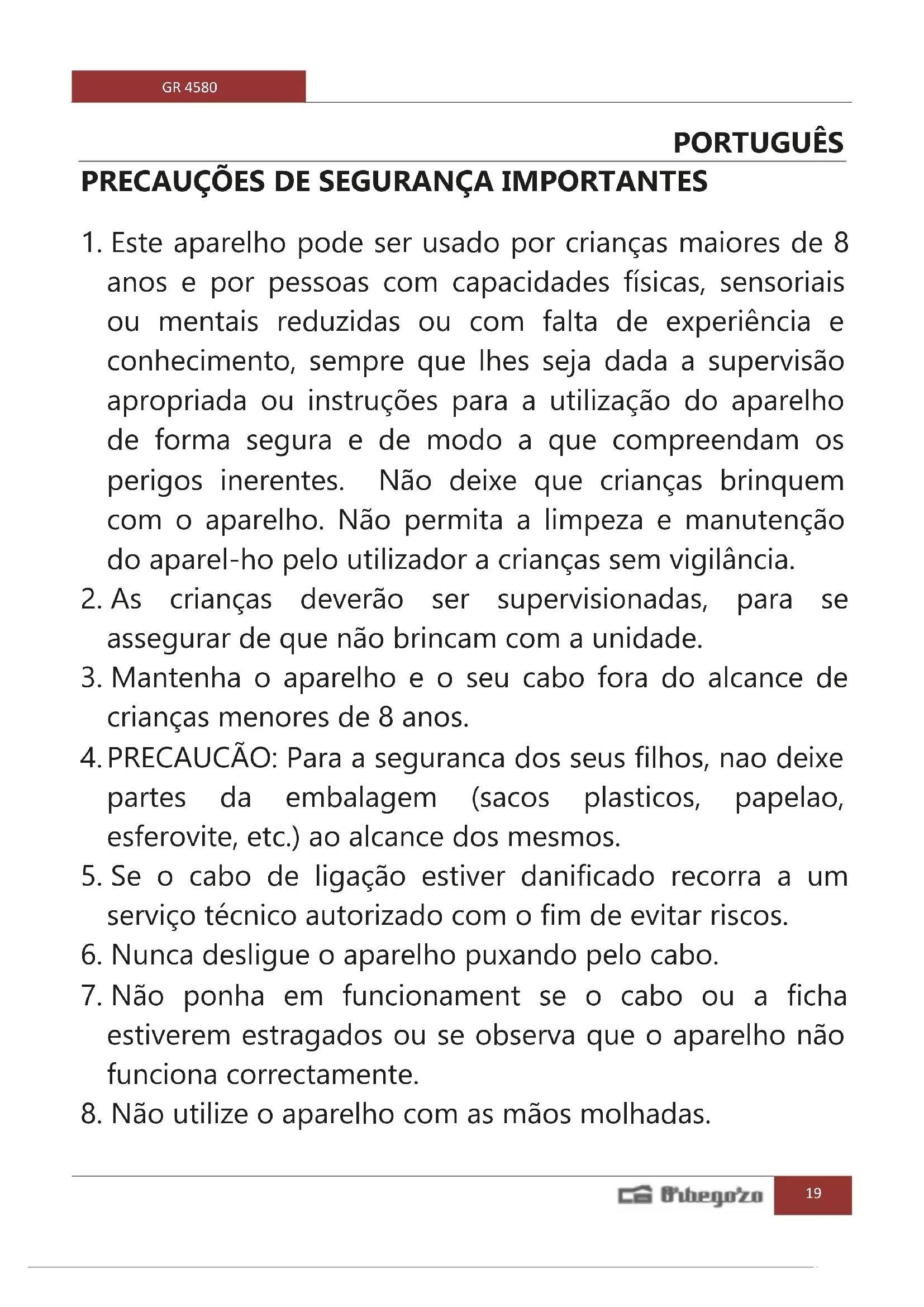 Encontre gratuitamente o manual do aparelho GR 4580 Orbegozo em formato PDF.