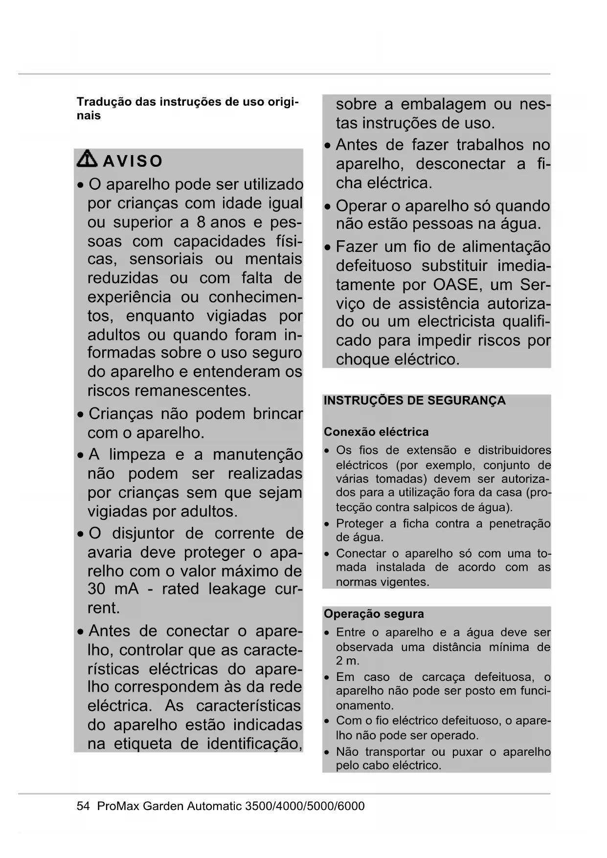 - Fazer um fio de alimentação defeituoso substituir imedia- tamente por OASE, um Ser- viço de assistência autoriza- do ou um electricista qualifi- cado para impedir riscos por choque eléctrico.